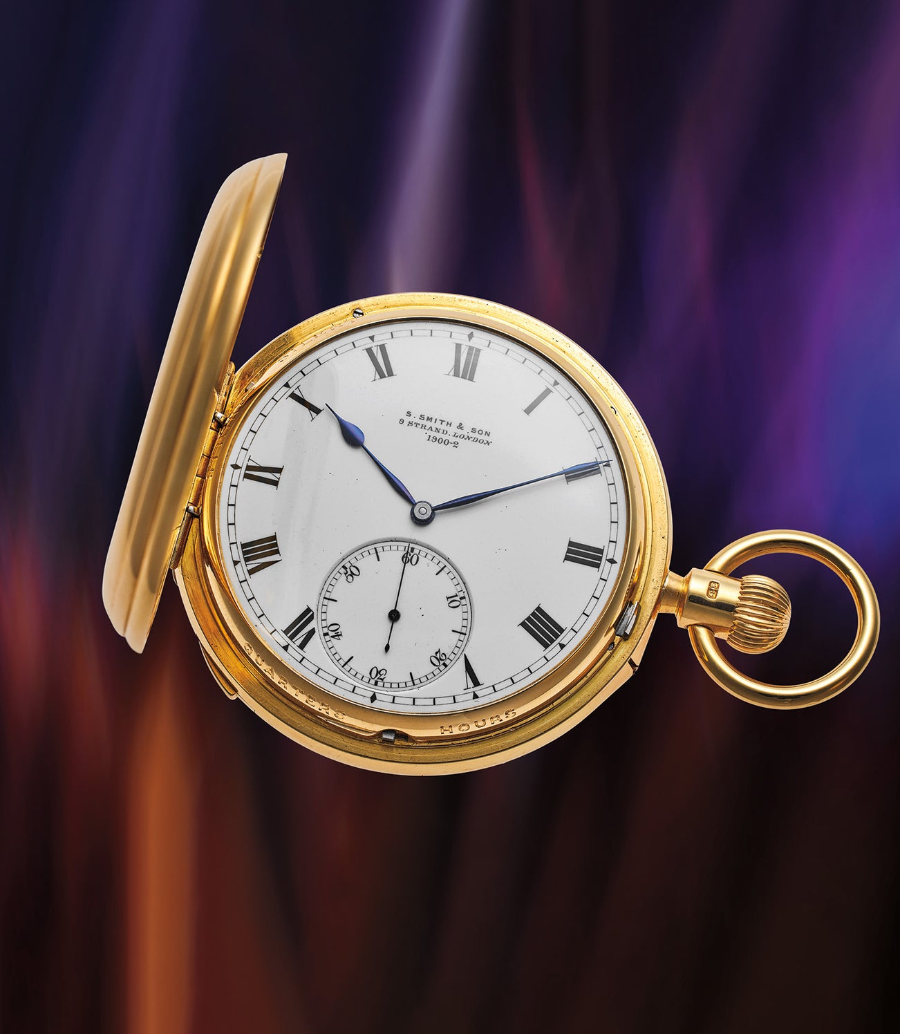 The present S. Smith & Son clock watch from 1899 is an exceptional example of the finest in English horology and a wonderful representation of those who lead the way. Combining a grande and petite sonnerie with minute repeater, it will strike the hours and quarters automatically, as well as strike the hours, quarter and minutes on demand when activated through the slide at 7 o’clock. Measuring an impressive 60mm in diameter, the four-body, massive yellow gold hunter case features 5-knuckle joints, a turning pendant, and a raised push piece, as well as two selection levers that permit the owner to choose between Grande/Petite Sonnerie mode, or Strike/Silent.