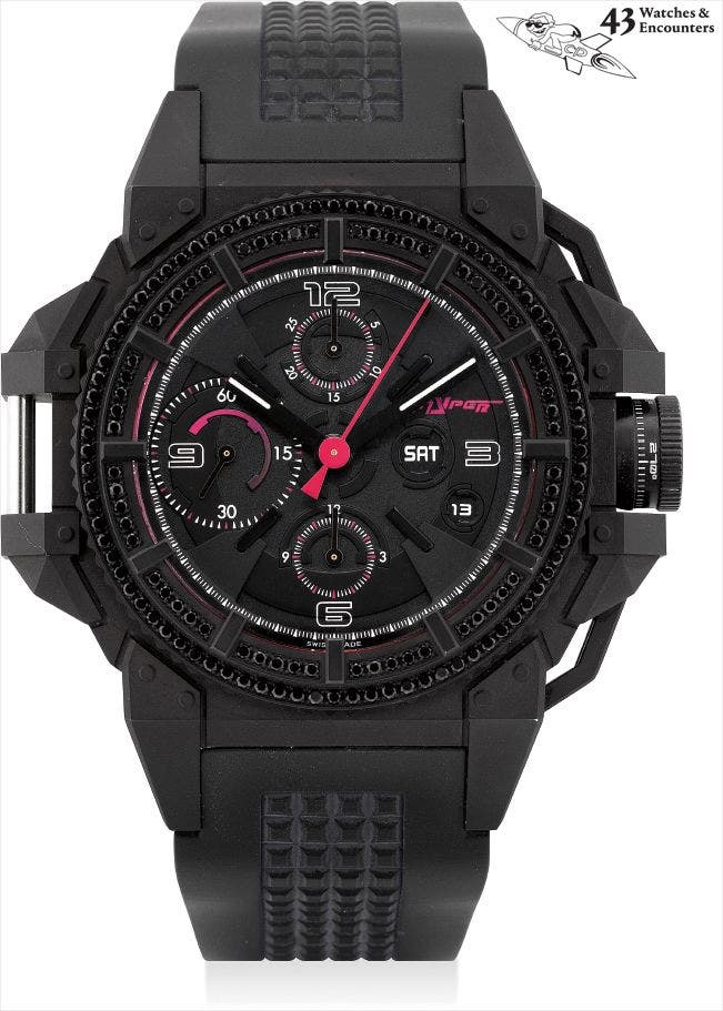 'Much inspired by the design and performance of elite force equipment, the present watch is designed to reflect the strength and precision of the world’s best snipers. The present chronograph wristwatch features an add-on function, allowing the wearer to attach Snyper Module equipment, such as lighters or laser pens, onto the two fixed bars at 9 o’clock. The bezel is further enhanced with 144 brilliant-cut diamonds, giving the watch a mysterious appeal.'