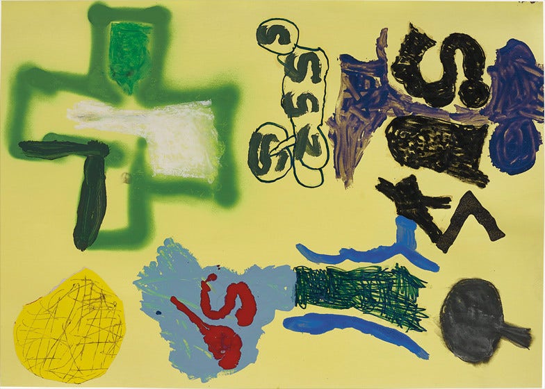 acrylic, nail polish, spray paint, Sharpie, ink, graphite, oil pastel and collage on paper