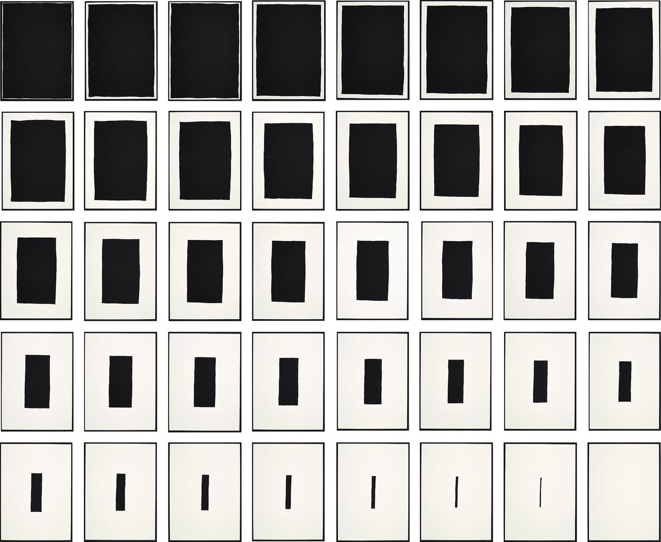Using a prescription to direct the creation of a work, the artist’s hand subordinated to the artist's thoughts, in direct contrast to the Abstract Expressionist movement earlier in the century. Actions, forms and adjectives were broken down into terms, serially repeated and reconfigured: grids, lines, shapes, color, directions and starting points are several examples. These directives and constructs fueled an influential career of vast variety, subtlety and progression.