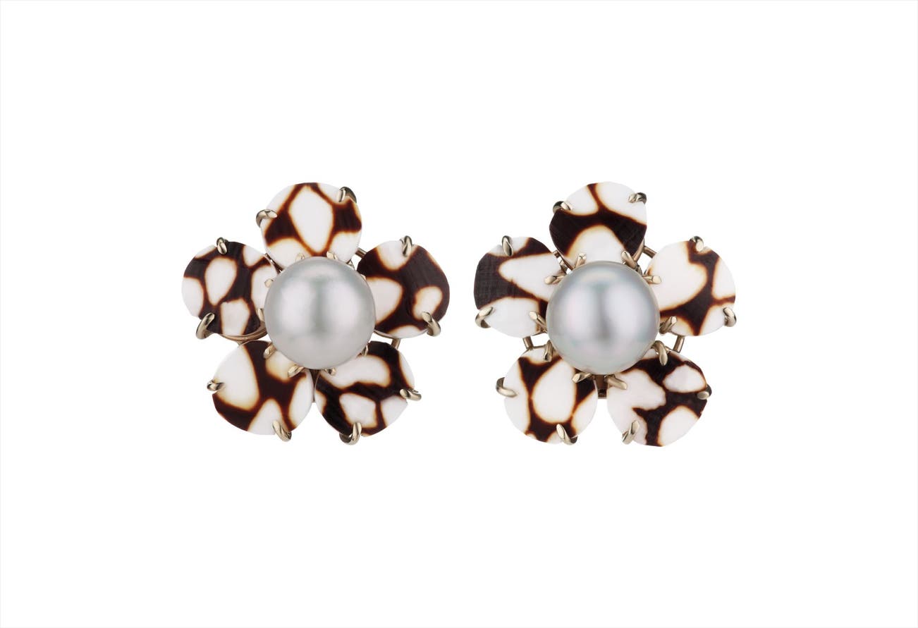 Each designed as a flower set with carved cone shell petals, centering upon a South Sea cultured pearl measuring approximately 12.40 mm, mounted in 18K white gold, length 1 1/4 inches.