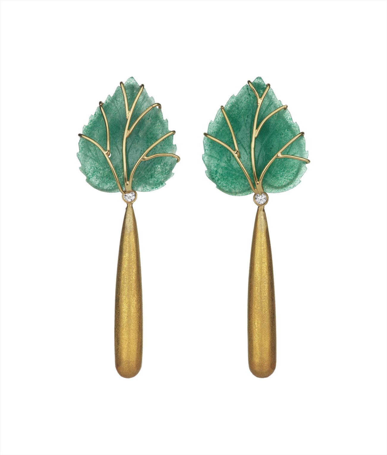 Each suspending a detachable textured gold drop and collet-set colored diamond, from a carved foliate aventurine quartz surmount enhanced by polished gold accents, mounted in 18K yellow gold, length 3 1/4 inches.