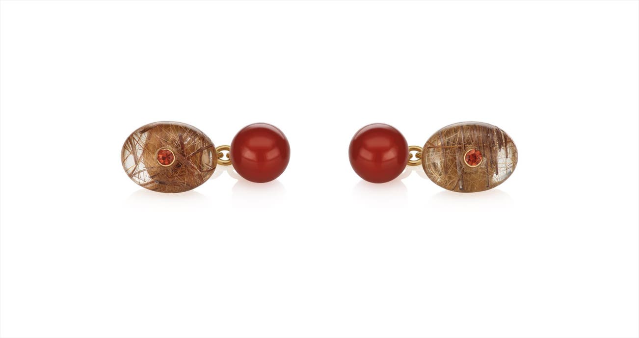 Each designed as an oval rutilated quartz plaque, enhanced by a circular-cut orange sapphire, to the carnelian bead link, mounted in 18K yellow gold, length 1/2 inch.