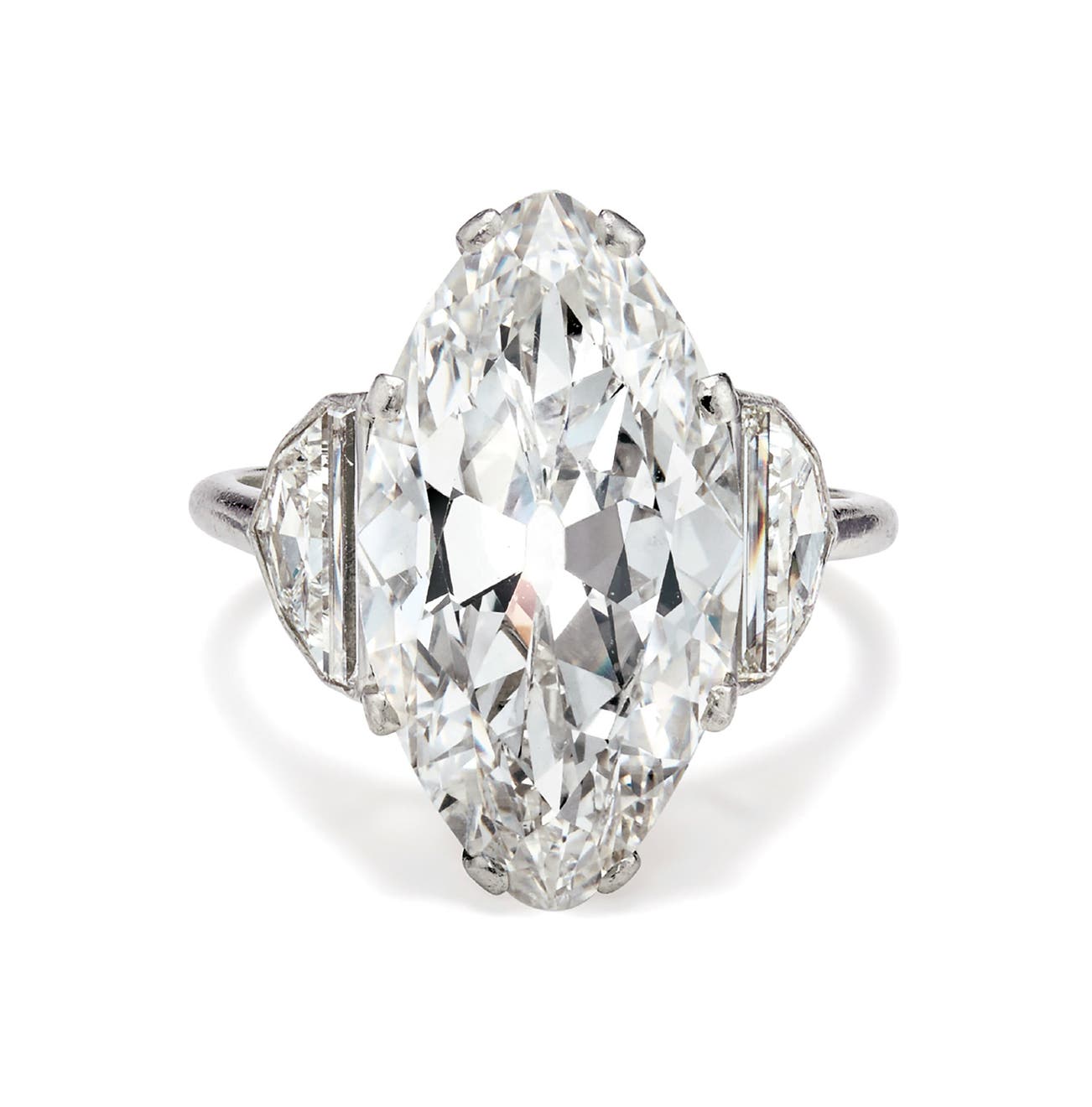 This Art Deco, 7.69 carat, marquise-cut diamond ring stands apart not only for its substantial size, sensuous shape and premier color, but also for its type IIa designation, as type IIa represent only one percent of all natural diamonds.