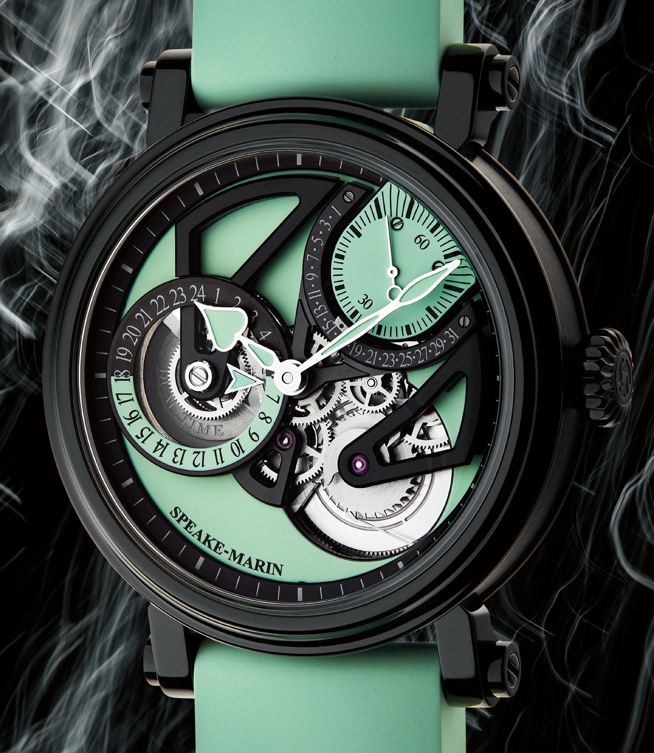 In 2021, Speake-Marin introduced the Dual Time Mint as a limited edition of 28 pieces. The black DLC-coated titanium case is inspired by the Black Architecture movement– which combines several architectural styles: modern, contemporary and minimalist. It proposes a monochrome architecture where black is the main color; contrasting with the audacious mint green color chosen as a hymn to freedom.
