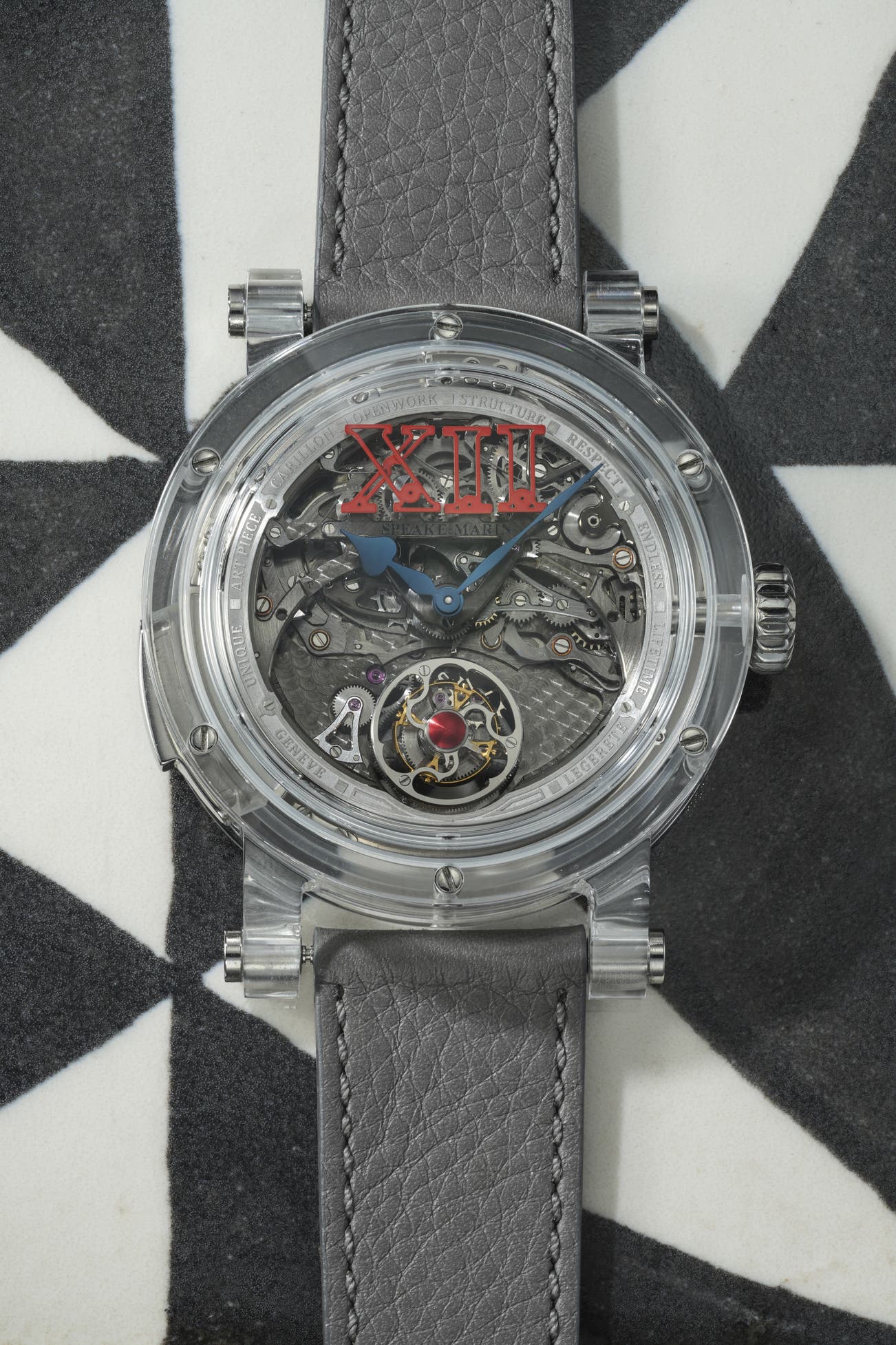 A unique and advanced tourbillon sapphire skeleton wristwatch with carillon minute repeater and dial animation