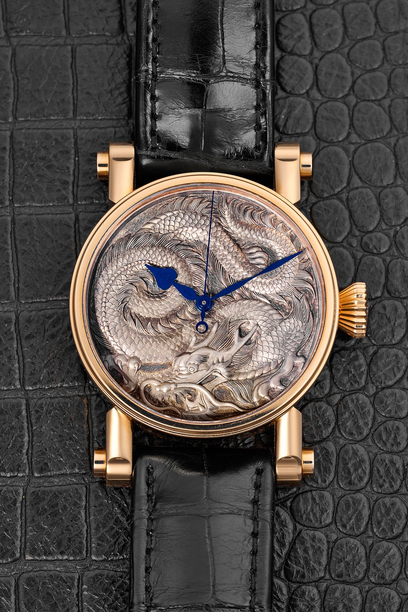 • A unique piece entitled “Captive in Time”, this Piccadilly features a hand-made dial crafted by noted dial artisan and watchmaker Kees Engelbarts. A frequent collaborator with Mr. Speake-Marin, his engraved dials are set apart with his use of the Japanese technique of mokume-gane”, wherein multiple layers of different materials are compressed into one plate and then the design is carved into the multilayered surface. Engelbarts, whose name can be seen on the caseback, frequently utilizes Japanese motifs, particularly dragons.