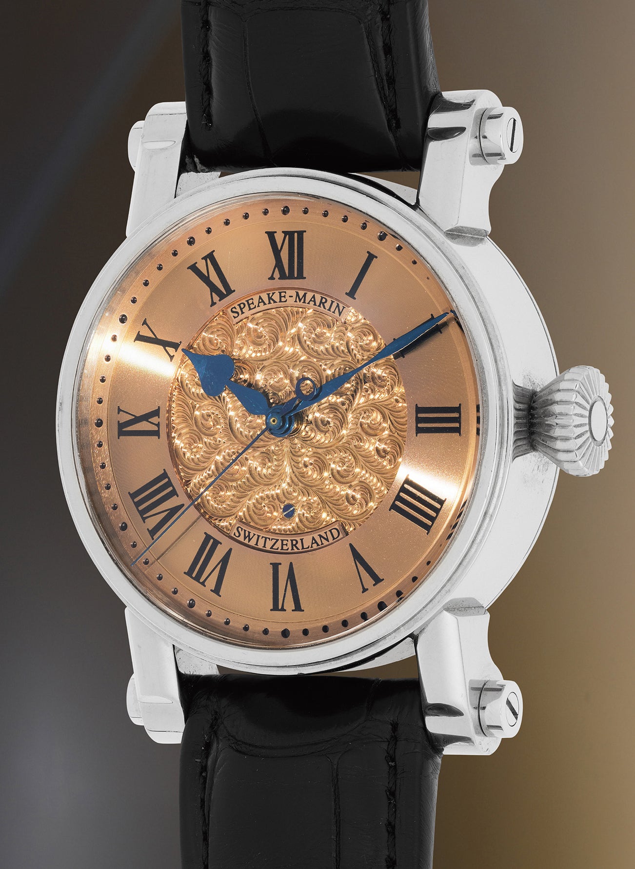 Today, Speake-Marin is an established independent Swiss brand under new ownership since 2012, manufacturing bold, modern timepieces with impeccable craftsmanship. The present early Piccadilly wristwatch from 2003 was the first wristwatch model offered by the brand. The 42.5mm-diameter white gold case is complemented by the handsome, hand-engraved pink gold dial. As a small atelier in its early years, Speake-Marin offered several series and unique dial types based on the original with white enamel dial. The case name is a tribute to London’s Piccadilly road, where the watchmaker began his career restoring antique watches.