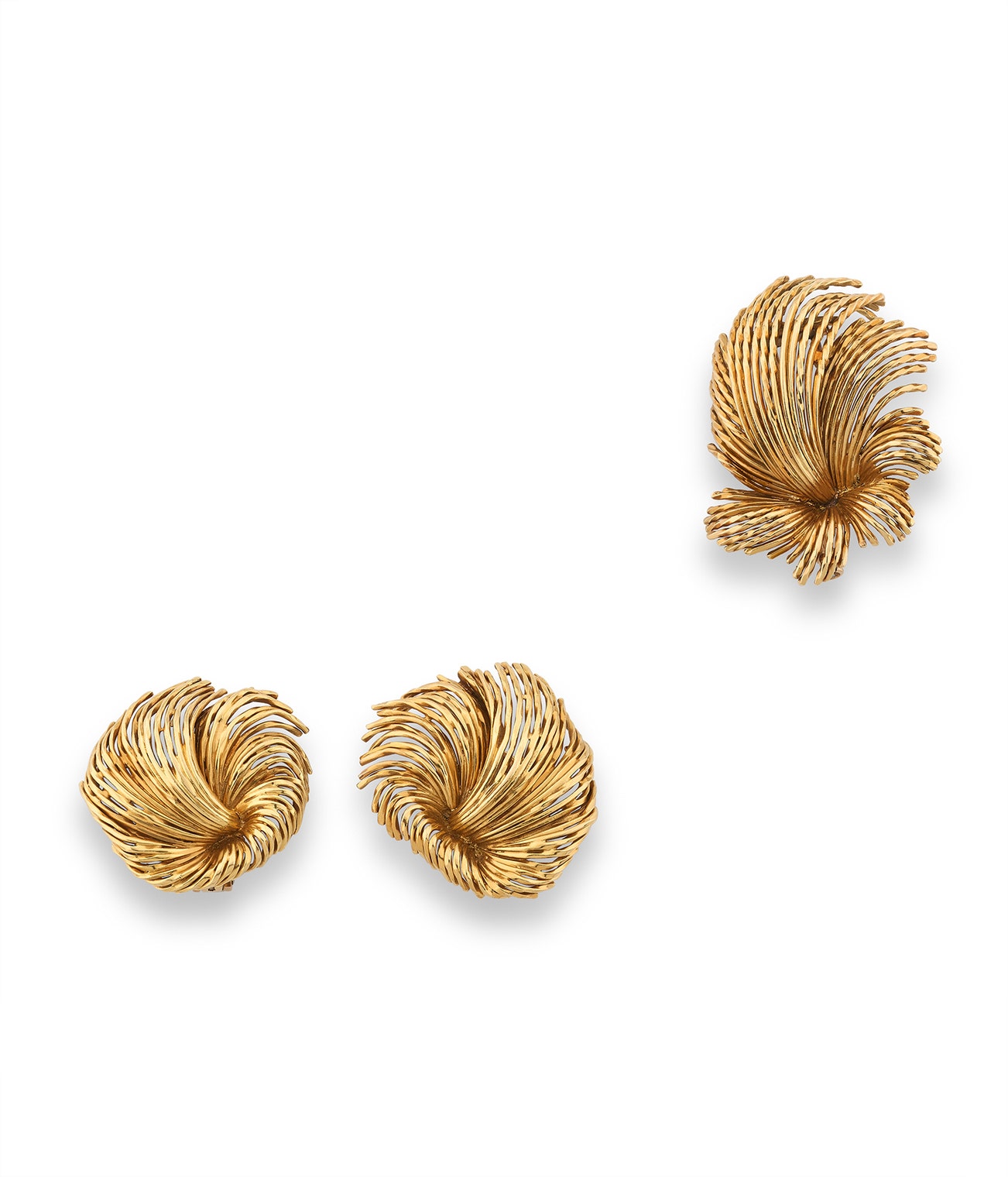 Comprising: a brooch, of foliate design, measuring approximately 40 x 30mm, and a pair of ear clips, of similar design, measuring approximately 25 x 30mm, signed Sterlé, French maker's mark and assay mark for gold, numbered.