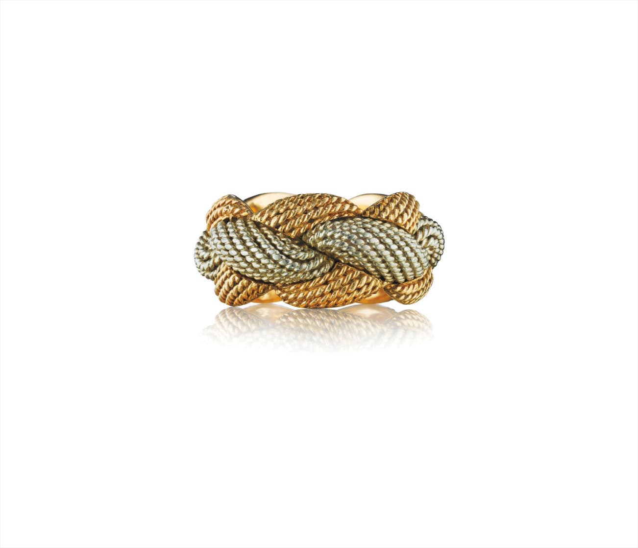 Designed as a braided textured gold band, mounted in 18K yellow and white gold, size 4 3/4.