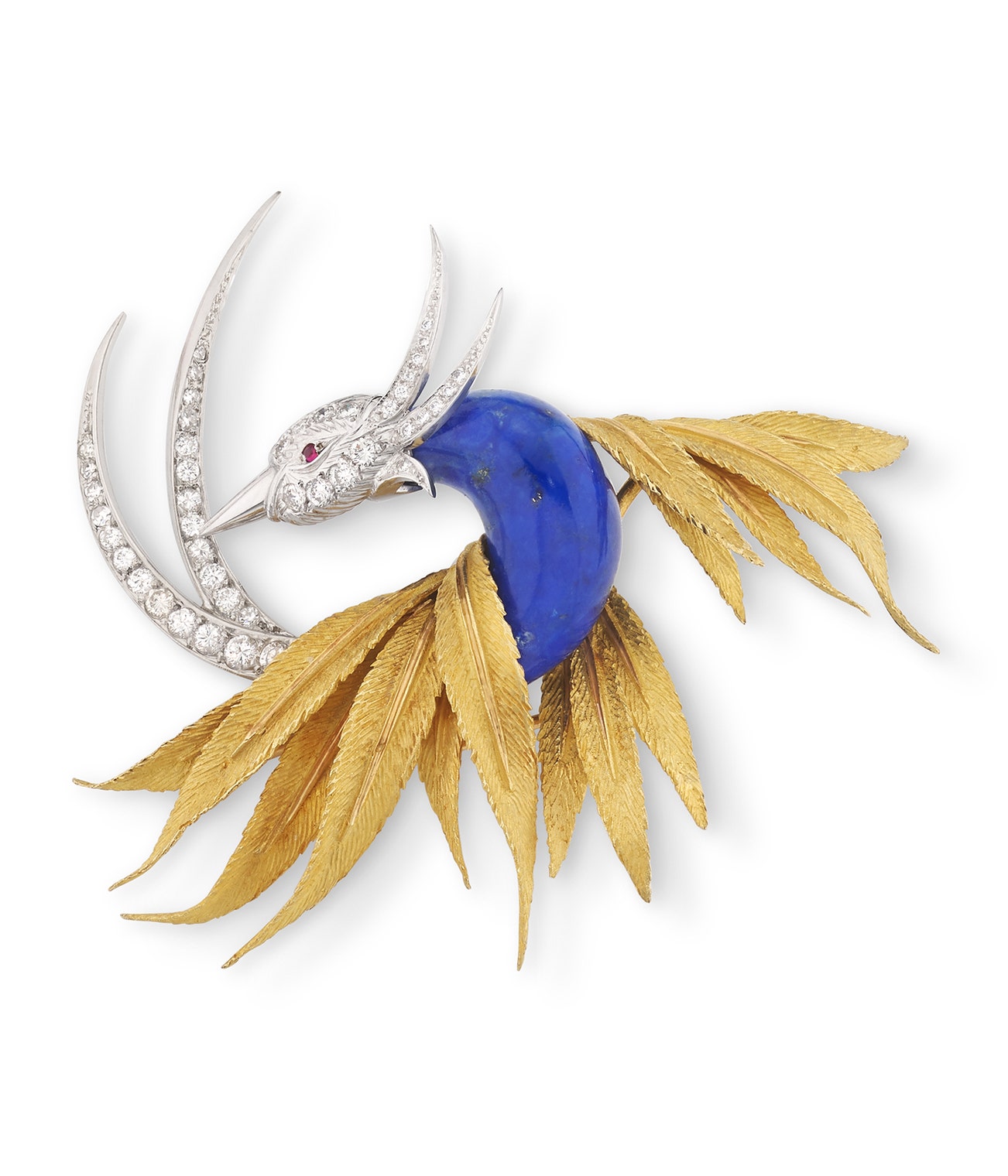 Modelled as a bird with gold feathers, the body set with a cabochon lapis lazuli, the tail and head embellished with brilliant-cut diamonds, and the eye set with a cabochon ruby, measuring approximately 55 x 65mm, signed Sterlé, numbered, French maker's mark and assay marks for gold and platinum.