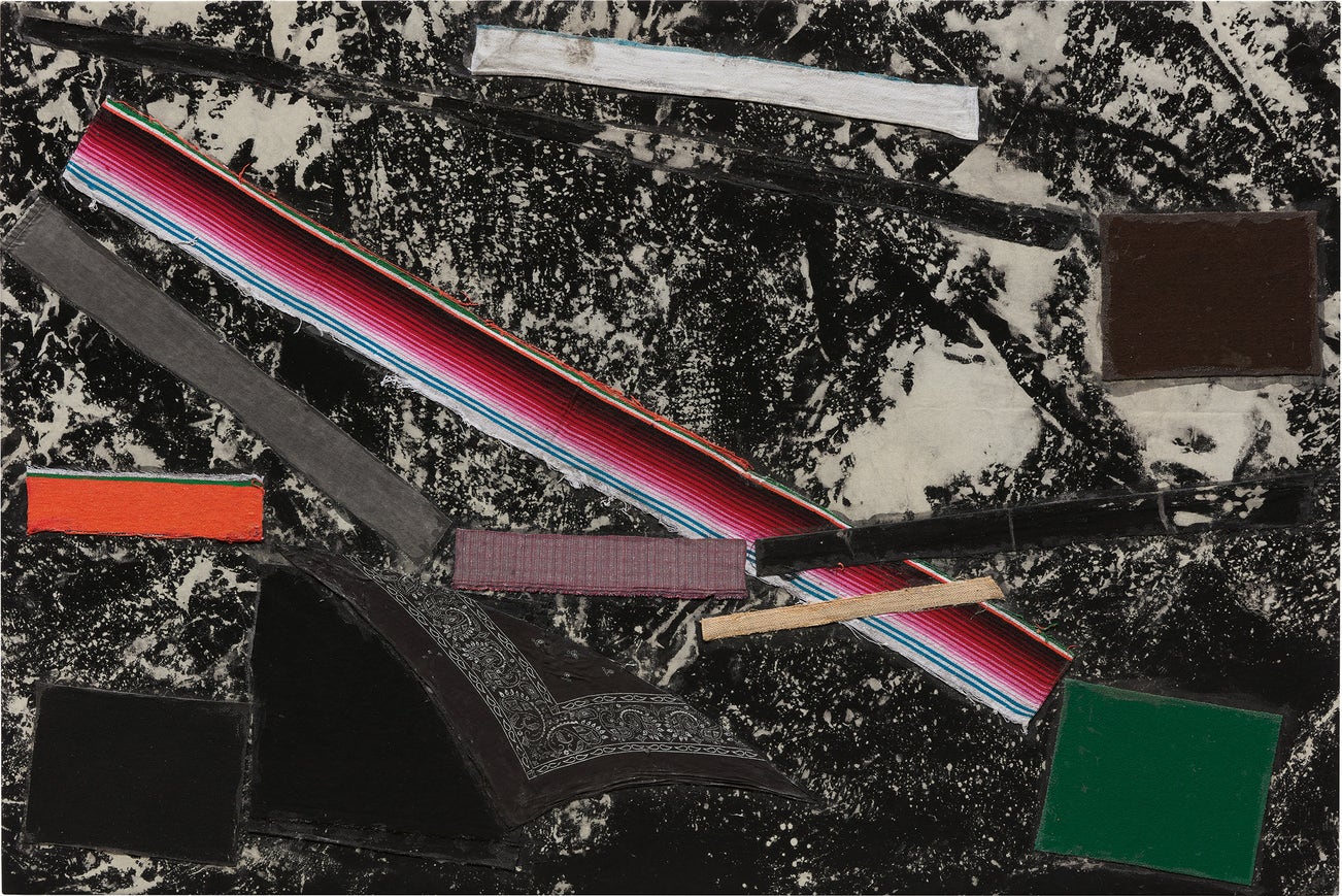 fabric, paint, glue and bleached canvas on panel
