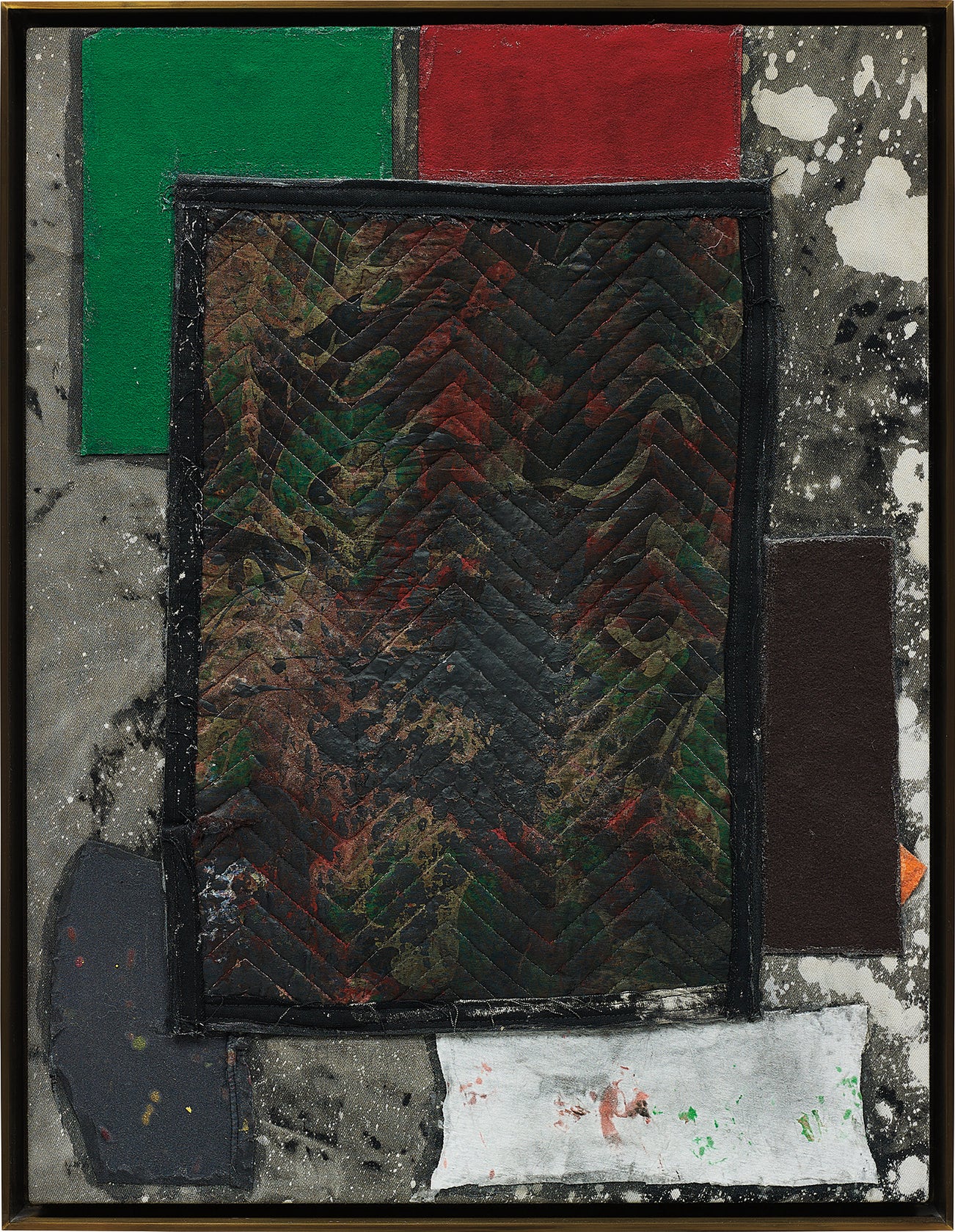 fabric collage, paint, bleach and glue on fabric mounted on wood, in artist's uncoated bronze frame