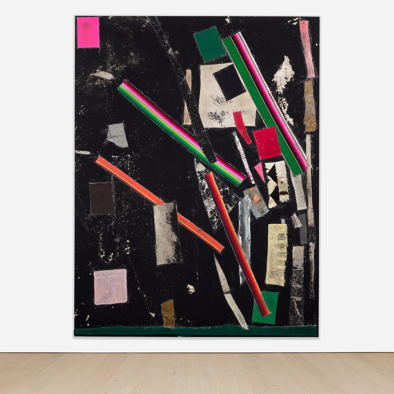 fabric, glue, urethane and bleached canvas on panel