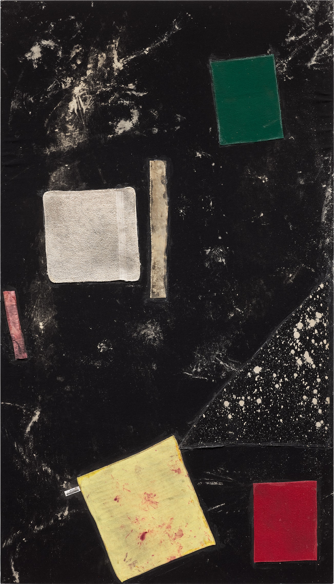 fabric, paint, glue, and bleached canvas on panel