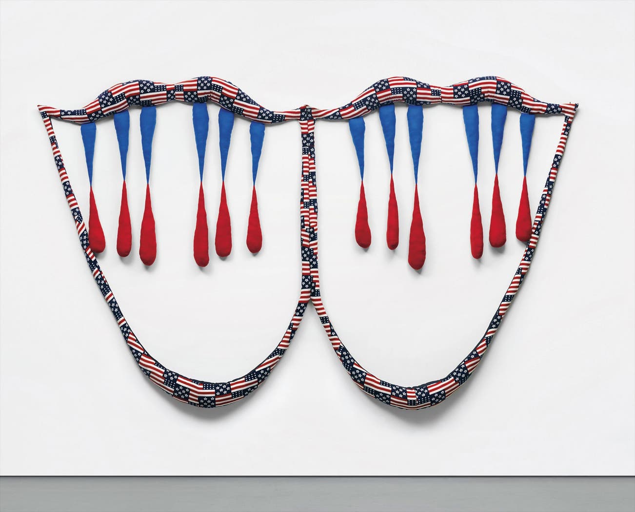 Double Vampire V, rendered in 2011, made from fabric stuffed with fibre fill is a resounding example of Ruby’s soft-sculptures. Following in the path of his American artistic predecessor, Claes Oldenburg, Ruby employs textiles to create a three-dimensional form that seems organic in its viscous or droopy appearance. In fact, it is dependent on the gravitational pull to keeps it in position. Double Vampire V is emblematic of Ruby’s Vampire series that also includes single vampire forms. In these large works grimacing mouths, ominous sharp fangs and exaggerated droplets of blood create an almost abstract decorative form – heightened by the nonrepresentational use of coloured or patterned materials. In Double Vampire V this effect is further highlighted by the duplication of the mouth in an interconnected form.