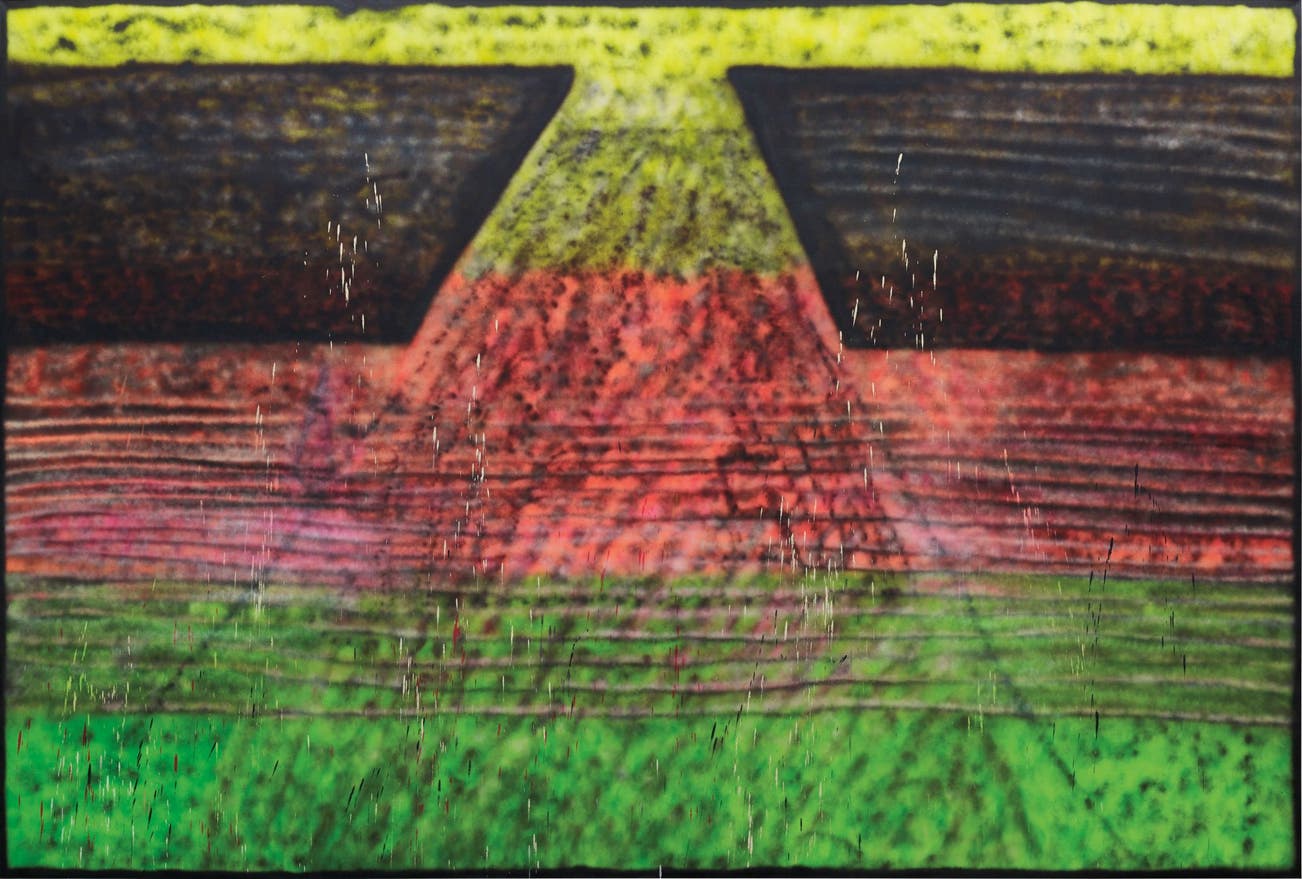 Amongst Sterling Ruby’s most recognisable works lie his vast kaleidoscopic spray-paintings that mark the artist’s furthest experimentations away from the formal and into abstraction. SP60 rendered in 2009, is an exemplar of this series of works, all of which are characterised by a hallucinogenic palette and multi-layered striations that indicate the energetic trail of the artist’s spray can. The overall gritty nature of Ruby’s paintings, generated through his graffiti-style method and strong use of dark tones, conveys an atmosphere evocative of the metropolis. In the present lot, vibrant striations of acrylic spray paint span the length of this horizontal work in a multifaceted ocean of colour only intersected by a pyramidal form that mimics the tonal pattern from the background. Acid greens supersede toxic yellows and clash with dark black bands of paint - the effect of which has been described as containing 'the sublime refinement of Mark Rothko crossed with the anarchic gestures of spray-can graffiti'. (J. Deitch, quoted in The Painting Factory: Abstraction after Warhol, exh. cat., Museum of Contemporary Art, Los Angeles, 2012, p. 6).