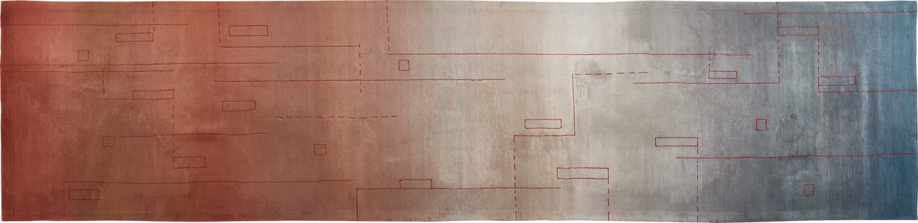 The present carpet is one of three designed by Steven Holl and produced by V’Soske in 1991 for the Stretto House in Dallas, Texas. The shaded effect was created by combining fifty-six colors in unique combinations in a special texture of cut-pile worsted wool yarn.