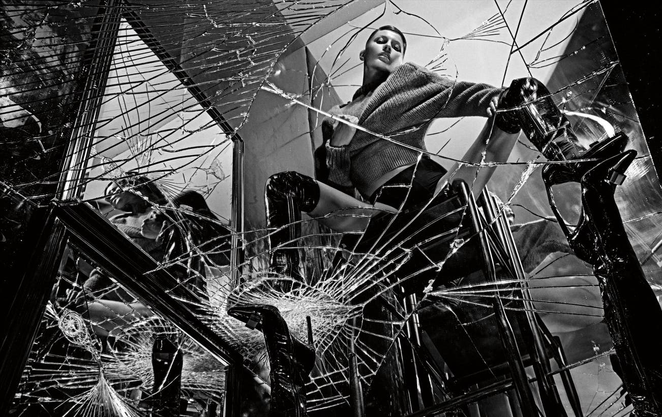 Steven Klein took this captivating photograph of Gisele Bündchen for Balenciaga’s Autumn/Winter 2014 campaign, while the brand was under the helm of Alexander Wang. By presenting an androgynous Gisele violently smashing her mirrored surroundings, Klein questions our expectations of female beauty and notions of vanity. Wanting to portray a ‘strong, powerful, mysterious and uncompromising’ female figure, Klein photographed the supermodel without her most famous feature – her flowing locks. Klein’s unique perspective provokes the imagination and draws the viewer into the chaotic scene, enhanced by the sharp geometry of the glass shards and fragmentation of the image into multiple layers through the mirror’s reflections.