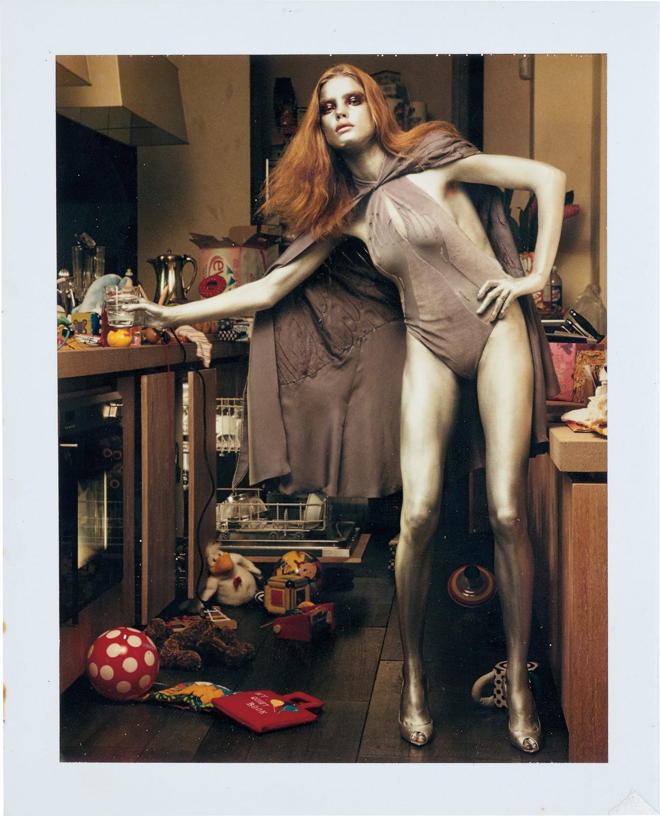 ‘This was a shoot with Natalia Vodianova and her then husband Justin Portman. It was shot on Halloween and Natalia wanted to go to a Halloween party. In this domestic setting, we decided to paint her silver.’