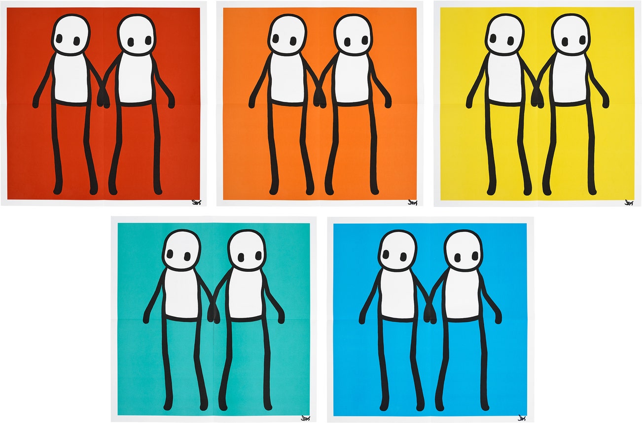 Five works: Holding Hands (Red, Orange, Yellow, Teal, Blue)