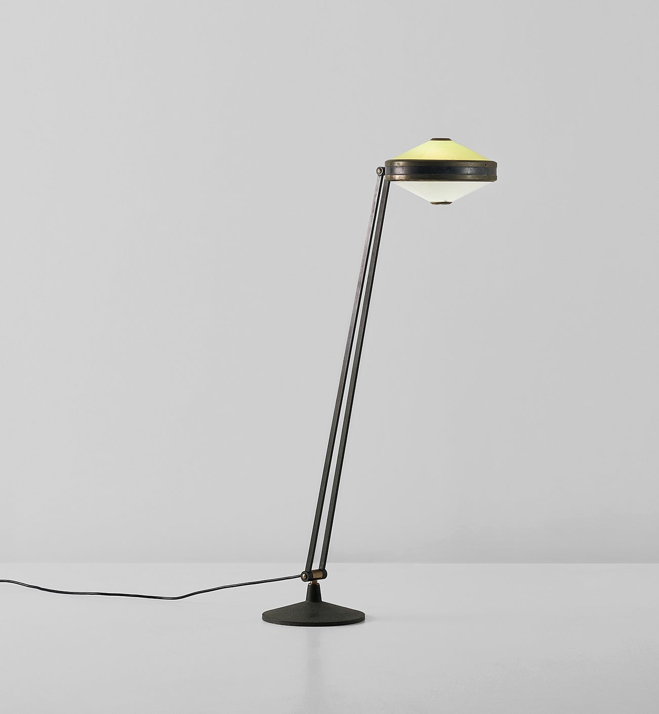 Manufactured by Stilnovo, Milan, Italy. Shade impressed stilnovo/PATENT and with manufacturer's label printed MILANO/STILNOVO/ITALY.
