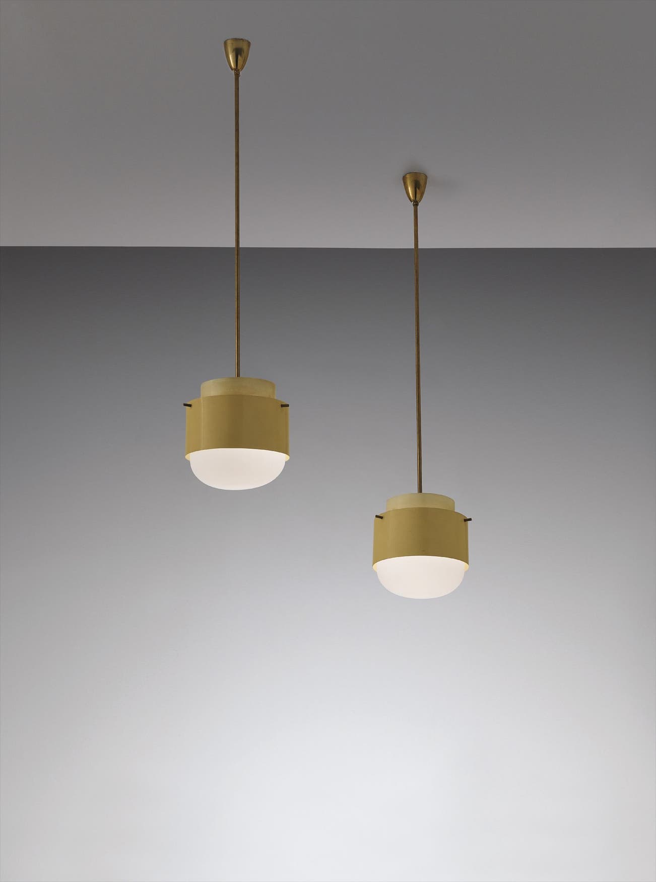 Painted metal, brass, tubular brass, frosted glass.