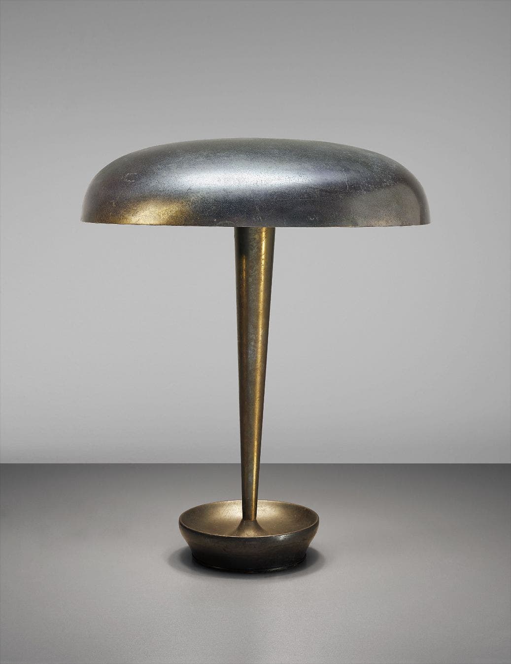 Patinated metal, painted metal, opaque glass.