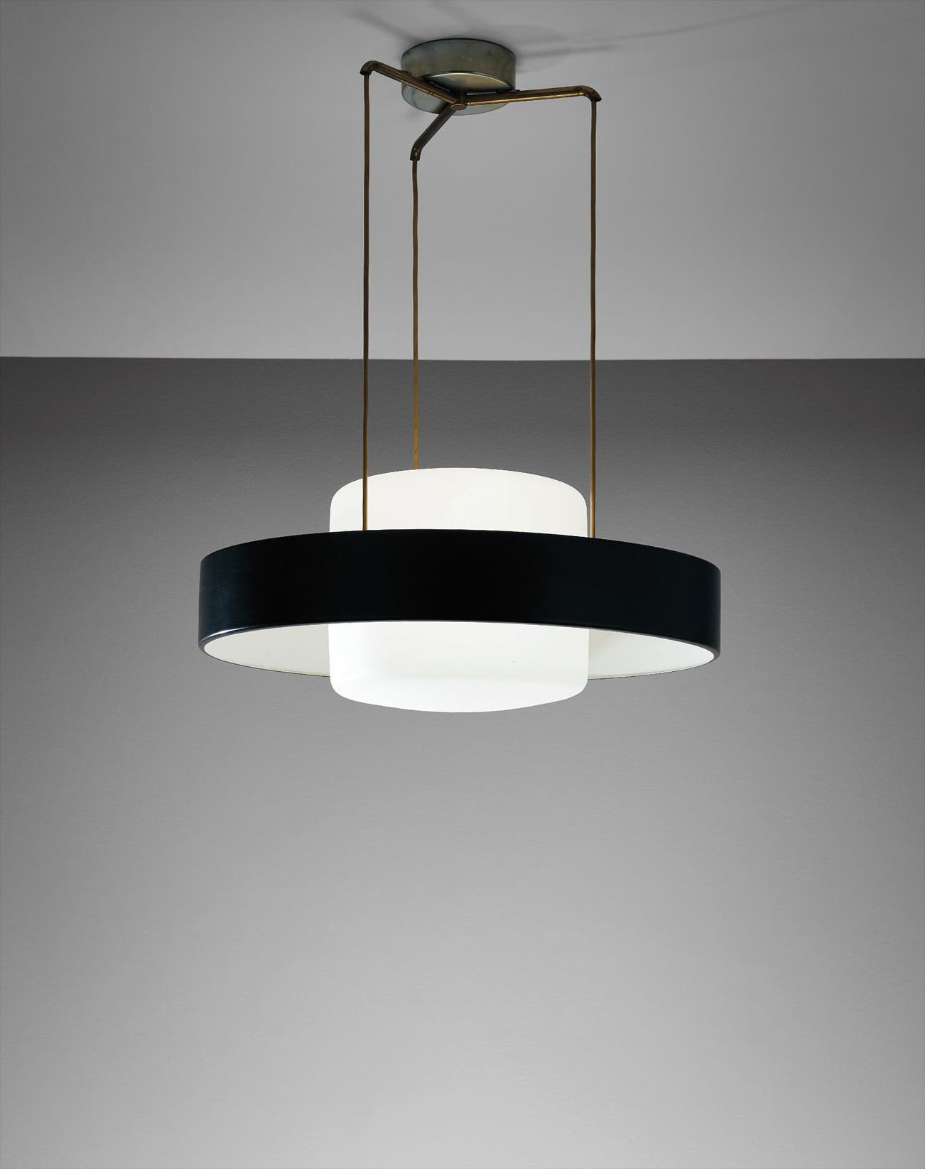 Painted aluminium, tubular brass, brass, chromium-plated brass, opaque glass.