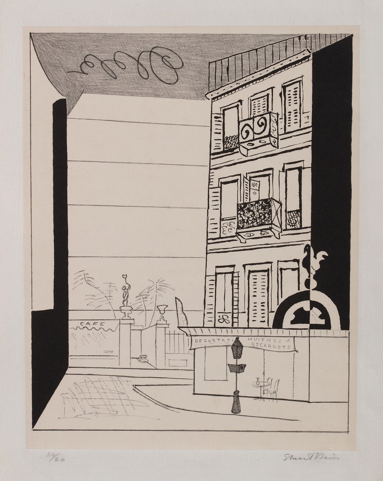 "...located in the 11th arrondissement...while the relation of the architectural elements remains intact, the central structure is reduced to its linear essentials. The delicately balanced composition is animated by the details that caught Davis's selective eye: the serpentine swirls of the balconies' ornamental ironwork, the urns in the far courtyard, the lamppost, and the rooster atop La Cressonee restaurant". Jane Myers, Stuart Davis: Graphic Work and Related Paintings, 1986, p. 24.