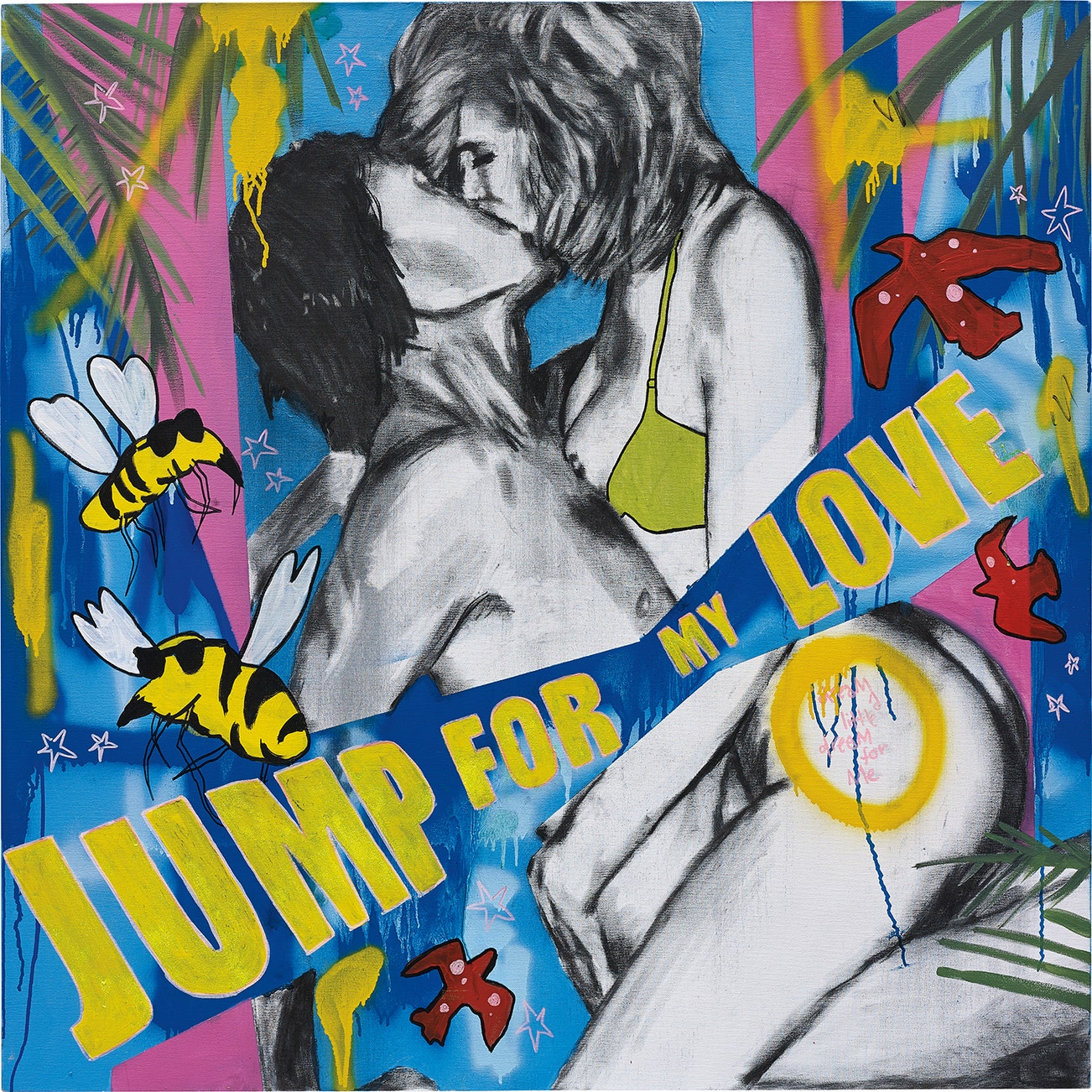 acrylic, charcoal, spray paint, marker pen and glitter on canvas