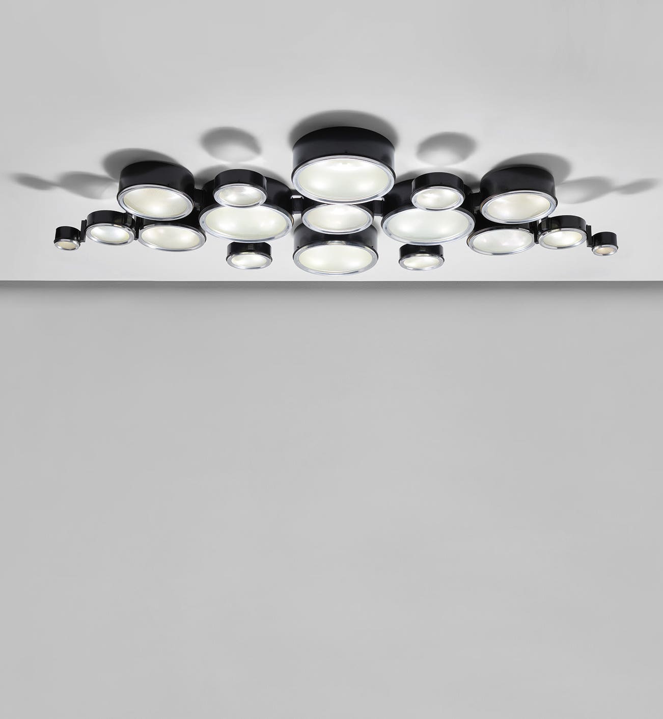Painted aluminium, aluminium, painted metal, acid-etched prismatic glass.