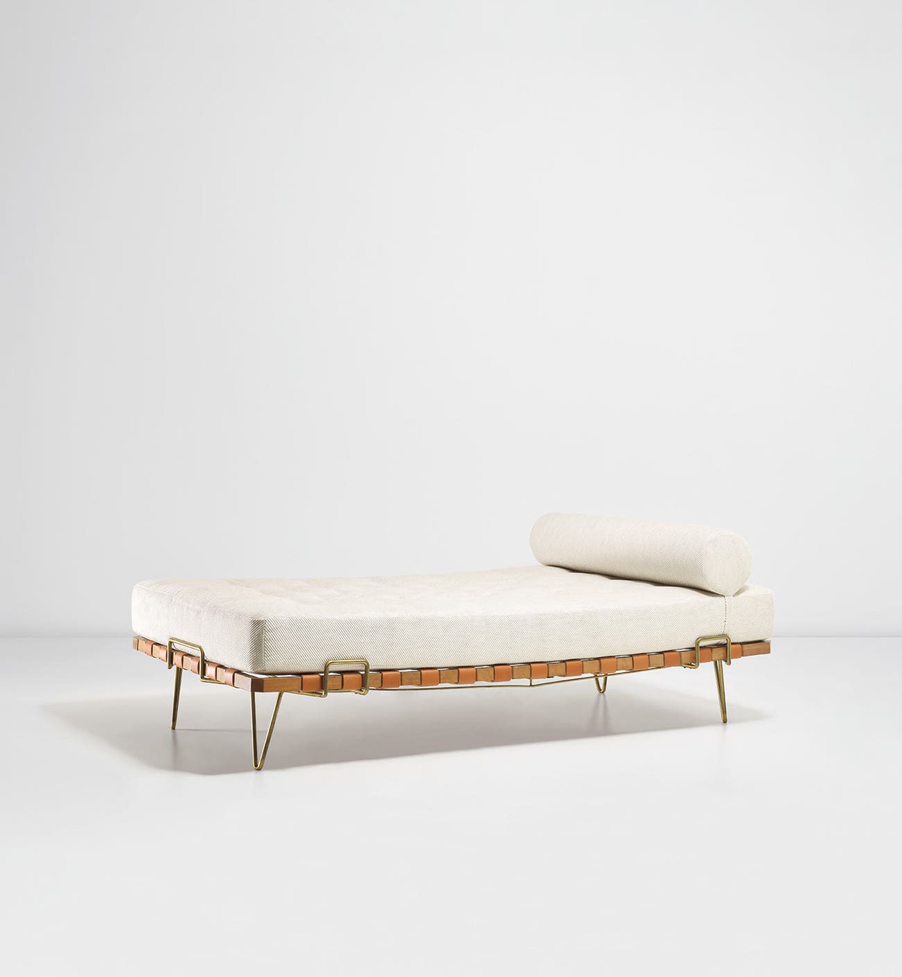 Cherry, leather, brass, fabric.