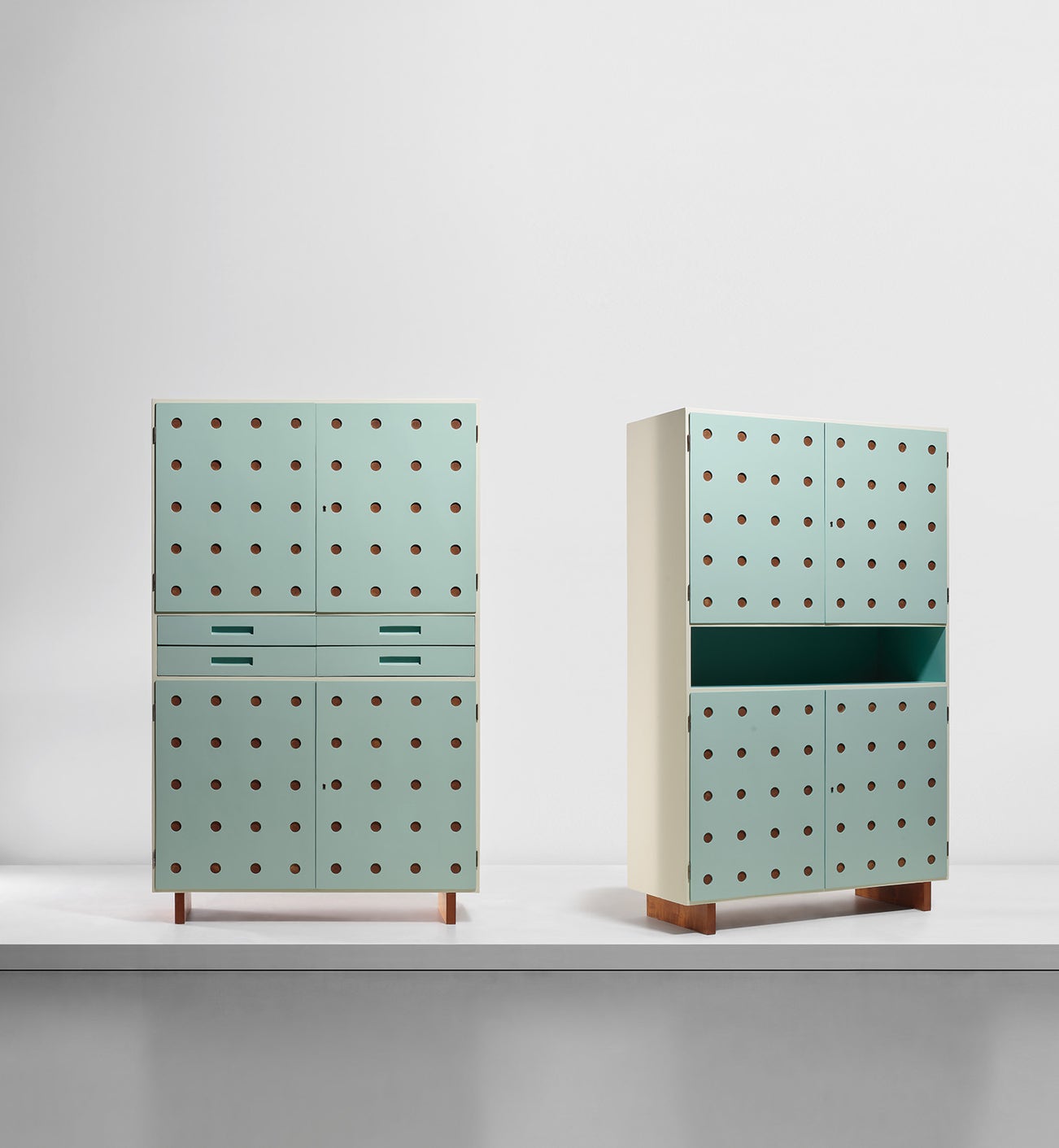 In 1932, after graduating from the Milan Polytechnic, the architects Gian Luigi Banfi, Ludovico Belgiojoso, Enrico Peressutti and Ernesto Nathan Rogers founded Studio BBPR based on their shared idea of the value of collectively designed work over that produced by the individual. While best known for their post-war architecture and urban planning, during the 1930s a large part of Studio BBPR’s practice focused on work for the Triennale and for individual clients, for which they designed custom-made works that were rigorous in form yet retained a strong human focus. The present two cabinets were designed by Studio BBPR as part of a commission for a Milanese apartment in the late 1930s. The cabinets’ vibrant blue painted doors are punctuated by holes that were originally designed for ventilation. While intended for the utilitarian space of the kitchen, the series of openings animate and structure the overall form of the two brightly coloured cabinets, uniting the designs' practical and aesthetic function.