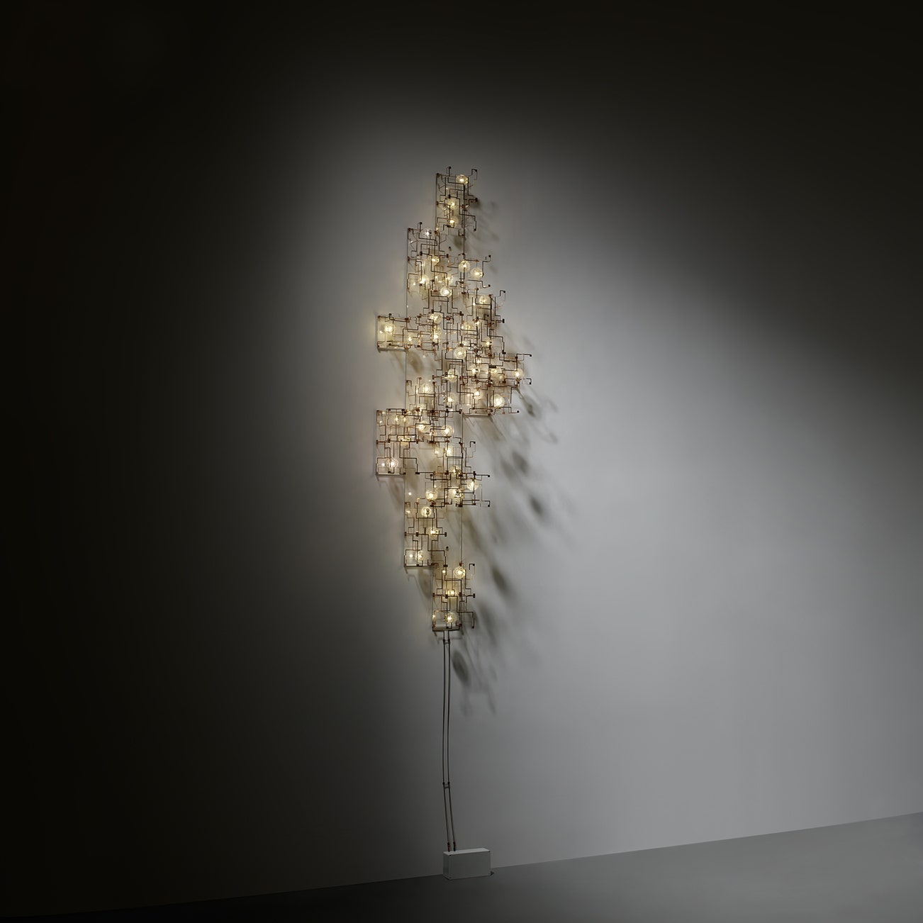 Phosphor bronze, LED lights, acrylic, dandelion seeds.