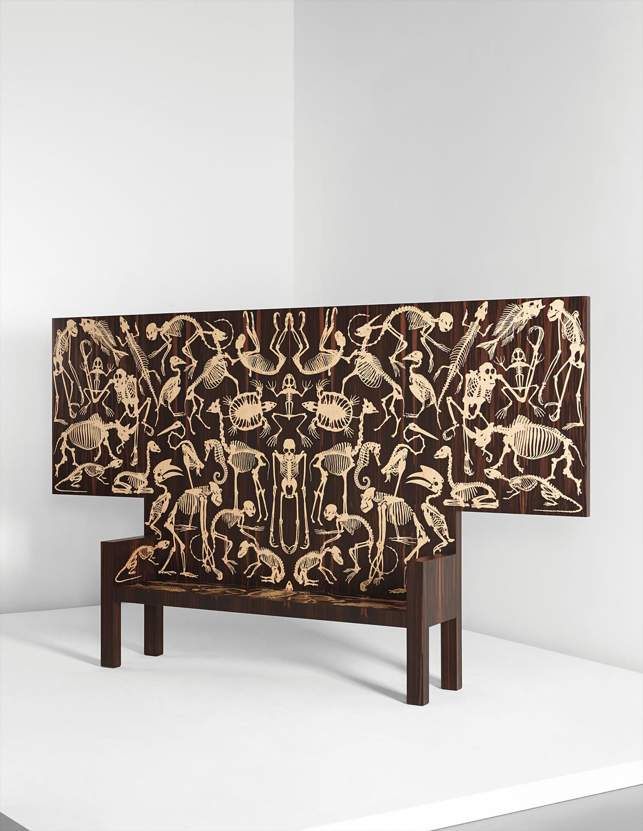 Macassar ebony-veneered wood, laser-cut bird’s eye maple inlays.