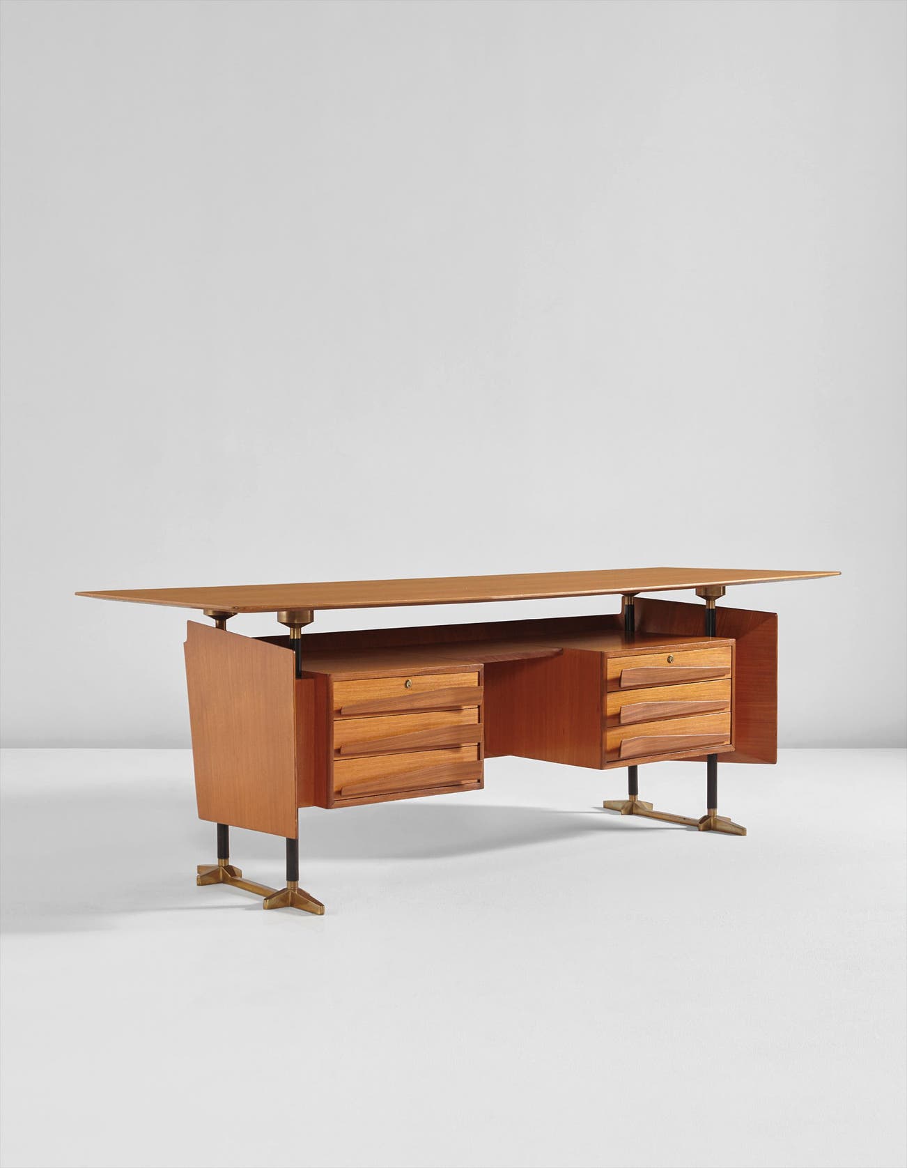 Teak, teak-veneered wood, brass, painted steel.