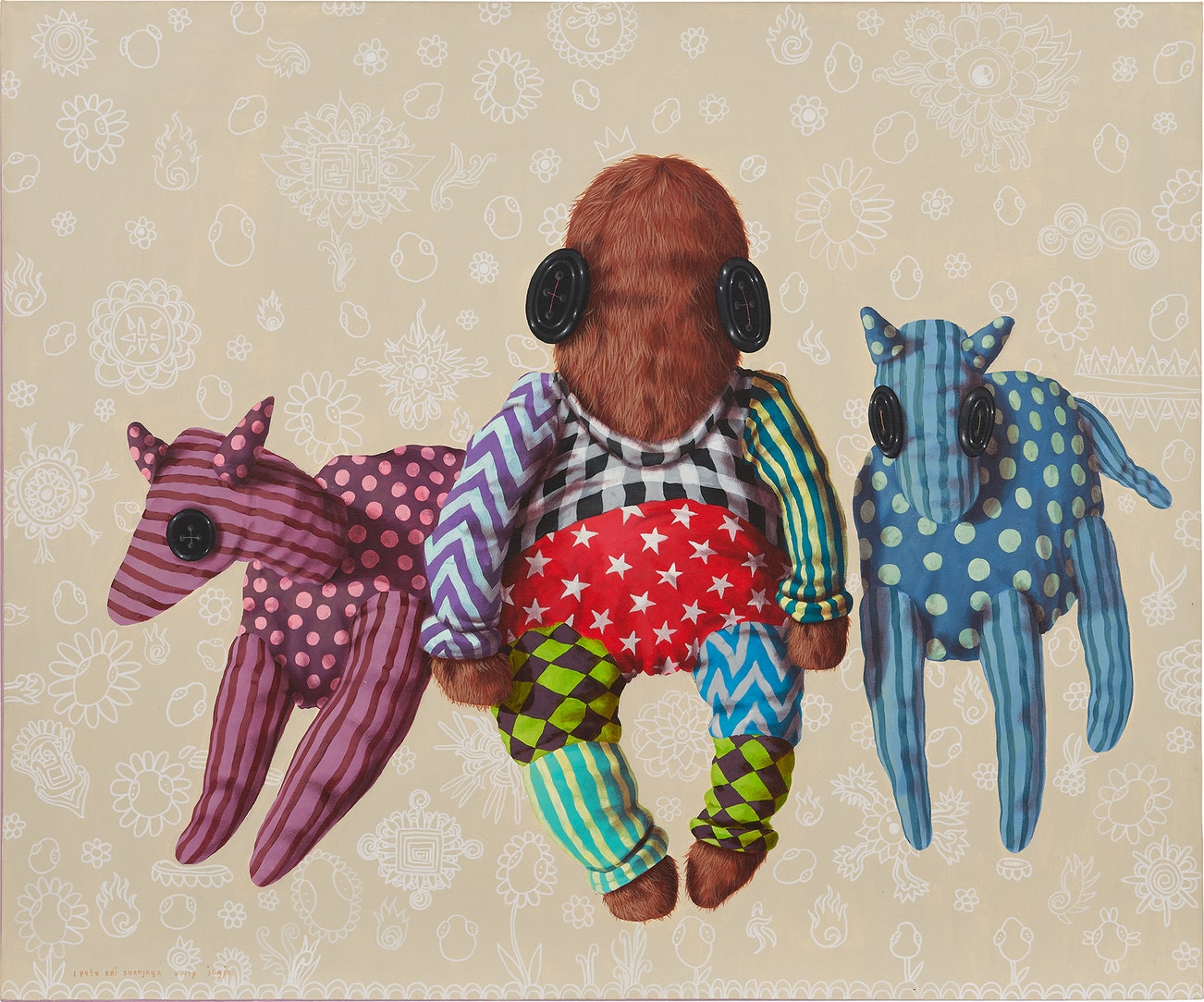 signed, inscribed and dated 'I putu adi suanjaya 2017 jogja' lower left; further signed, titled, inscribed and dated 'I Putu Adi Suanjaya "Kencut" "Two Bodyguards" 2017 Yogyakarta" on the reverse