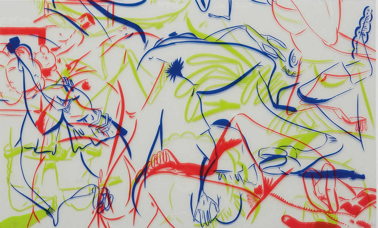 Three screenprints in colors, on transparent Mylar paper layered (as issued), the full sheets.