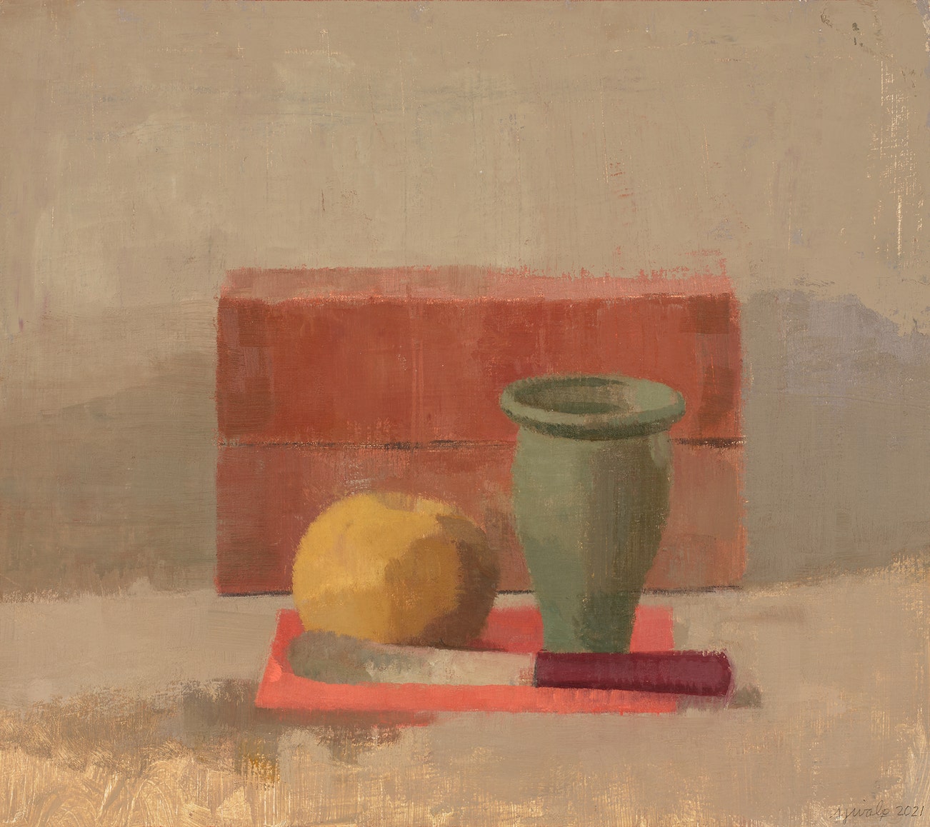 Bricks, Apple, Small Green Vase, and Red-Handled Knife