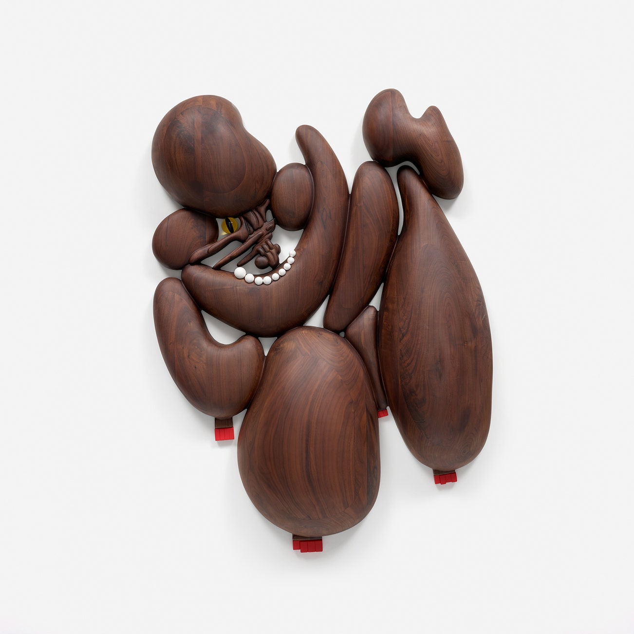 Polished walnut wood sculpture with glass and crystal resin details, contained in the original foam-lined wooden crate.