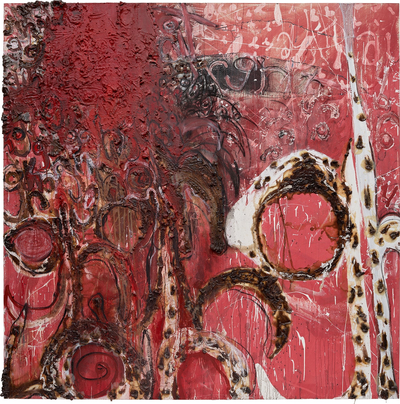 clay, charcoal, acrylic, oil, synthetic medium and gesso on canvas
