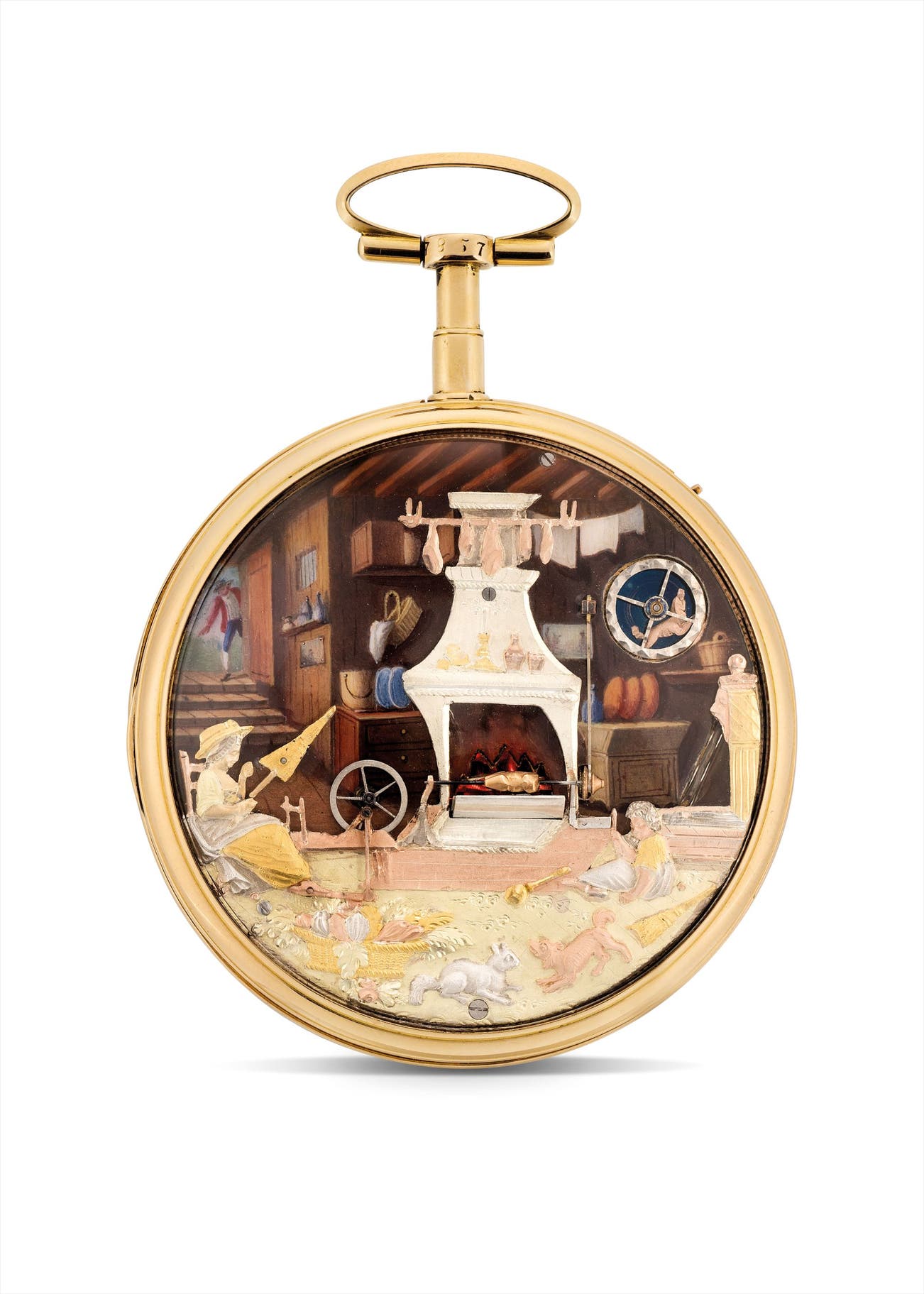 The present watch features a household scene, with different objects moving to illustrate a busy day in the kitchen. When the watch is wound and the automata is activated, the lady's hand moves back and forth as if she is sewing. Her foot steps on the pedal, and then the sewing machine activates with its wheel spinning fiercely. The hearth, containing a spit with a turning roast in front of the automated flames is automated by the turning wheel and the dog inside is independently moving back and forth, and finally the water fall is nicely flowing. With seven separate actions, this watch is certainly one of the more complicated automatas from the period.