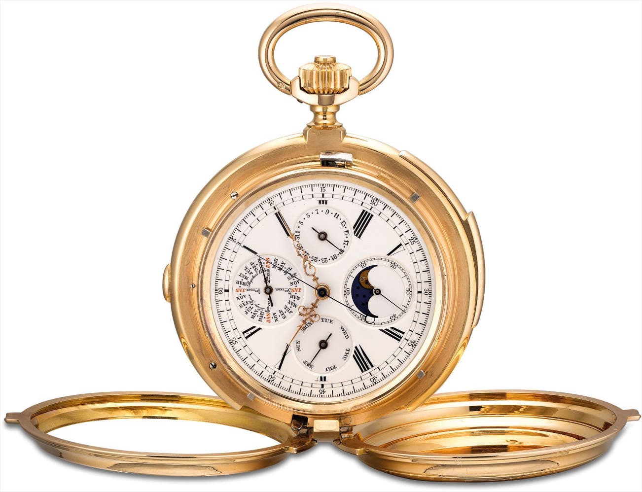This triple complication is in incredible overall condition. The watch is minute repeating, fitted with a perpetual calendar and moon phases and is also complemented with a chronograph. The dial is clean and intact. The movement is unsigned and the five-hinge case is both heavy and can also be converted from a hunter case to an openface watch, otherwise known as the Cabriolet case that was invented by Abraham Louis Breguet. Fresh to the market, this watch provides an extraordinary value proposition to the collector of complicated, rare and fine pocket watches.