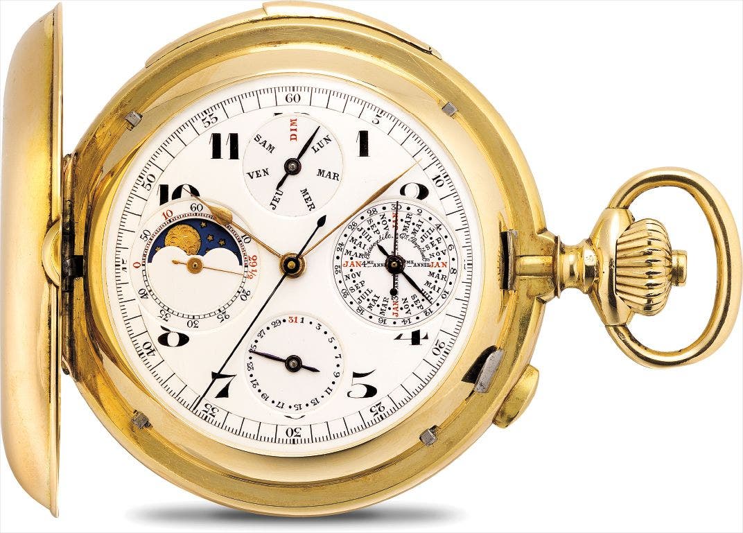 A fine yellow gold hunter case minute repeating perpetual calendar chronograph pocket watch with leap year indicator