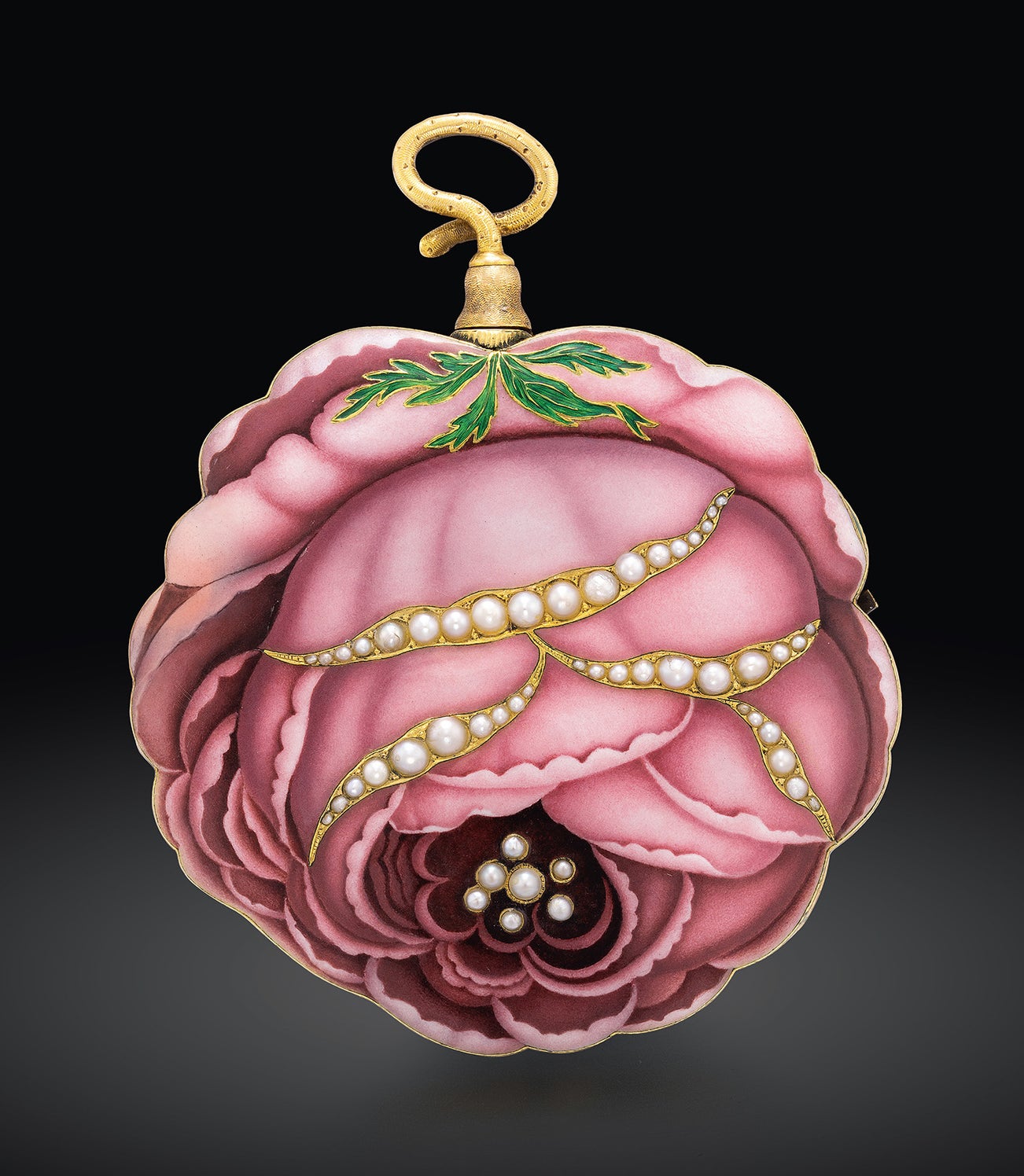 The present pendant watch is a particularly special example among the various pocket watches made for the Chinese market. Lavishly decorated with enamel, the bezel features flowers and scrolls in shades of white, orange, and blue, using both opaque and translucent enamel against a black background. This is merely a prelude to the fully enameled caseback, which showcases a stunning depiction of a rose. The shape of the case itself resembles a real rose, while the caseback is beautifully enameled in pink tones, mimicking the appearance of an opening rose with overlapping petals. The opening of flowers is highly welcomed in Chinese culture, symbolizing prosperity and good fortune. Partially edged with pearls and featuring pearl-set stamens highlighted by translucent green enamel foliage, the caseband is adorned with rose leaves in opaque green enamel, evoking the image of a flourishing garden. The cleverly concealed hinge on the caseband contributes to a luxurious and seamless design, often reserved for important timepieces like this.