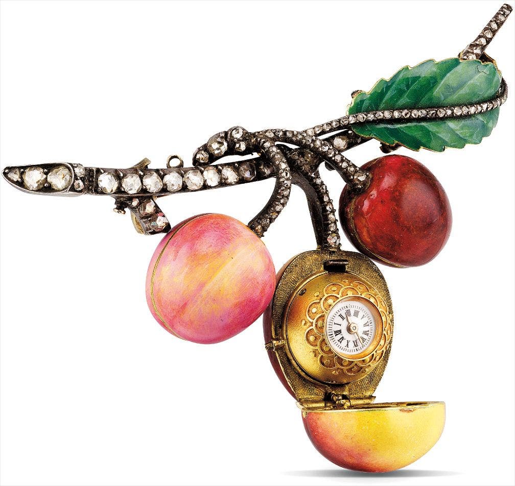 The present fantasy watch is in extremely well preserved condition with hardly any restoration to the cherries. The watch sits inside the largest cherry in the center, and can be visible when the end of the crest is pushed.