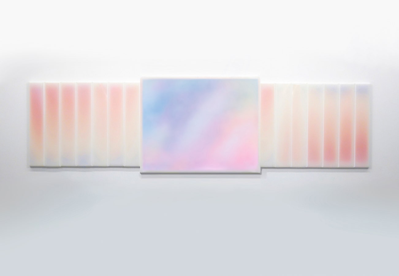Abstract painting has been a focus within Syagini Ratna Wulan’s artistic practice since 2016. Whilst her previous work has been characterised by a non-linear approach, more recently she has been focusing on interplays of light, colour and perception, and has been influenced by natural phenomena such as rainbows and spectral colours. Created from panels of plexiglass and arranged in a triptych format, Aether Atrium seems to blur not only pastel hues, but also the boundary between painting and sculpture.