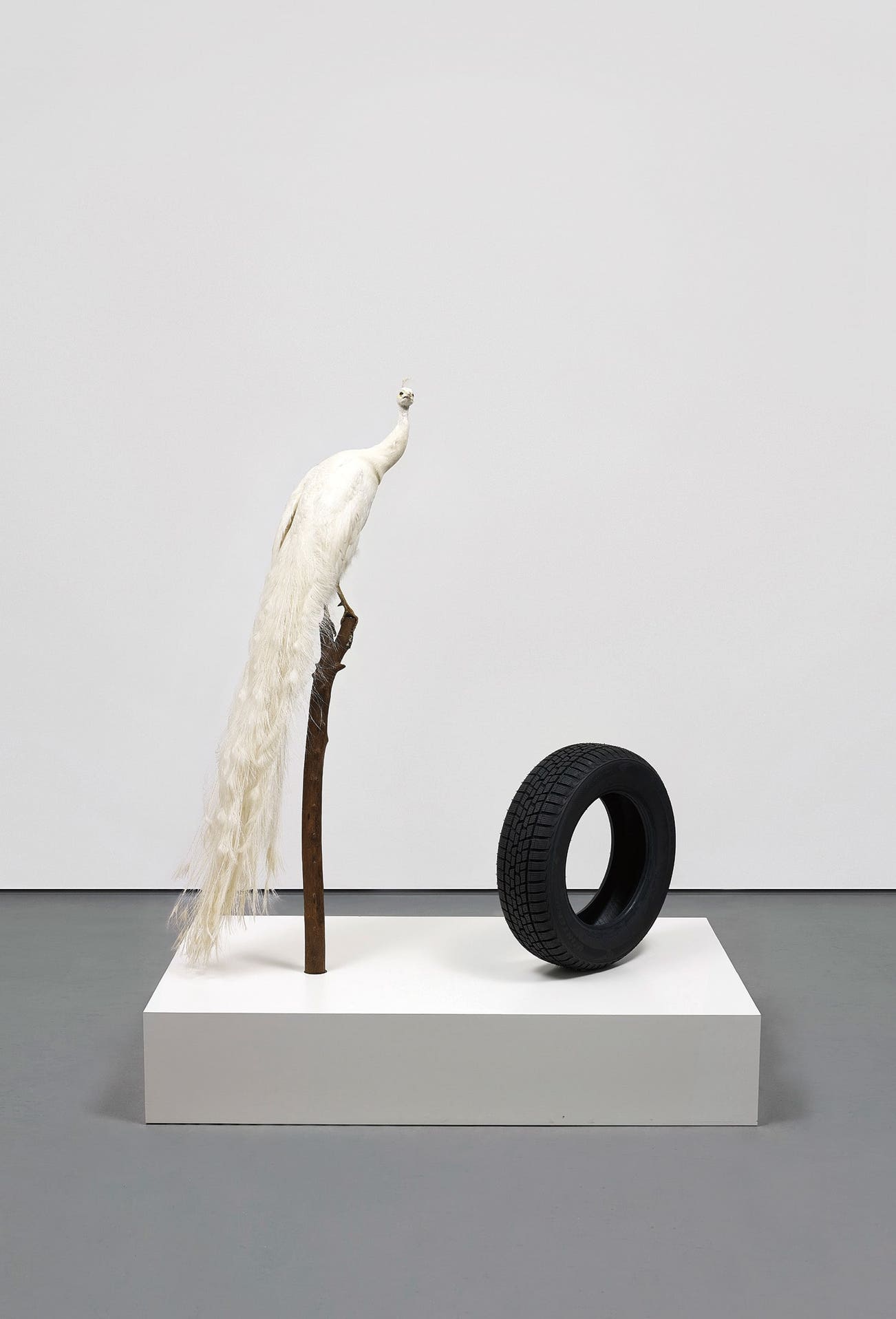 taxidermy peacock, black tyre and white pedestal
