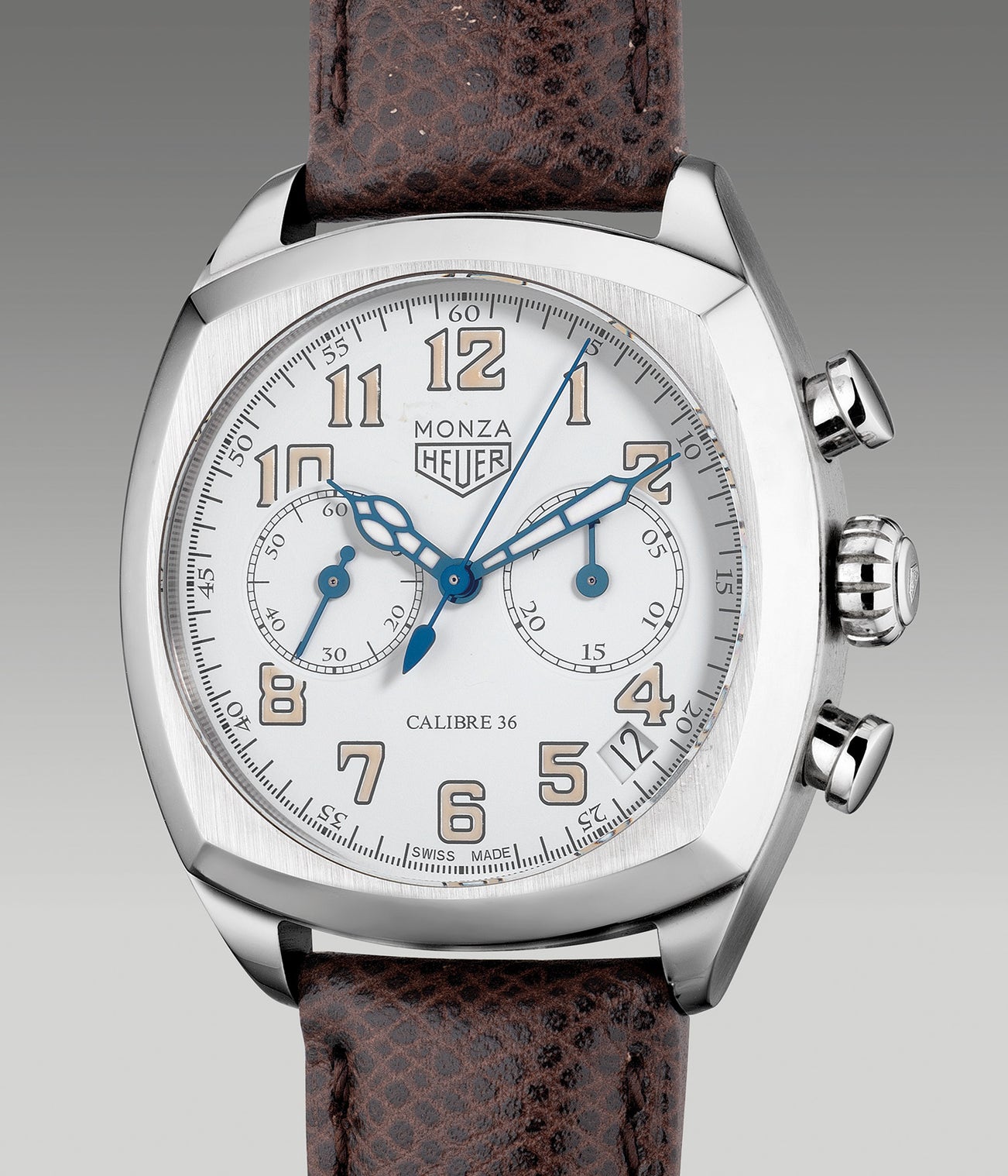 Released in 2011, the Tag Heuer Classic Monza re-edition limited to 1,911 pieces pays its homage to the iconic Heuer Monza from the 1930s. With strong retro-themed aesthetics, the present Classic Monza reinterprets its ancestral model by implementing a 38mm diameter cushion-shaped case with a brushed finish on the bezel. The dial is also designed to look like it was born from the 1930s featuring blued steel luminous filled hands that are reminiscent of the specific era matched with Art Deco styled creamy luminous Arabic numerals. Powered by the firm’s self-winding cal. 36, the movement is displayed through a sapphire display caseback, a modern touch.